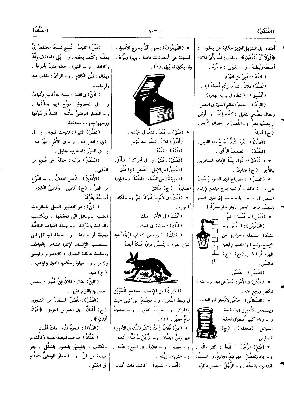 (الفانوس) النمام ومشكاة مُسْتَقلَّة جوانبها من الزّجاج يوضع فِيهَا الْمِصْبَاح ليقيه الْهَوَاء أَو الْكسر (مَعَ) (ج) فوانيس