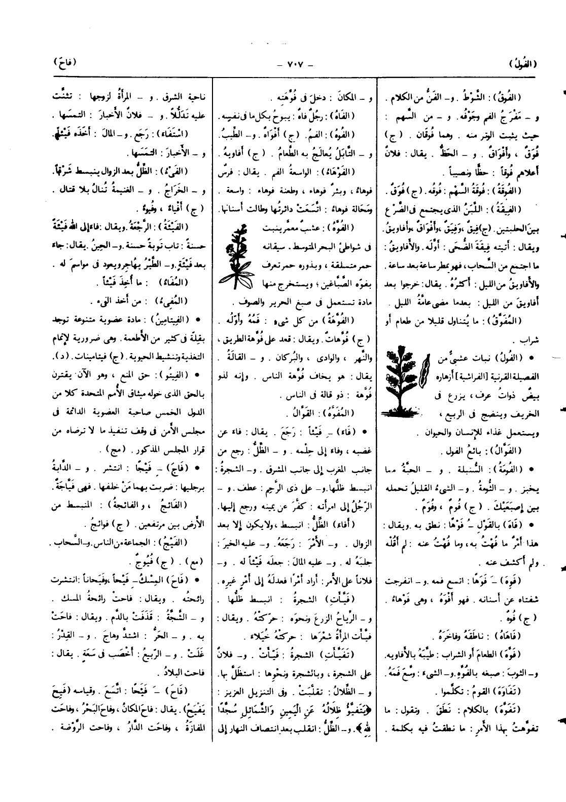 (أَفَاء) الظل انبسط وَلَا يكون إِلَّا بعد الزَّوَال وَالْأَمر رجعه وَعَلِيهِ الْخَيْر جلبه لَهُ وَعَلِيهِ المَال جعله فَيْئا لَهُ وَفُلَانًا على الْأَمر أَرَادَ أمرا فعدله إِلَى أَمر غَيره