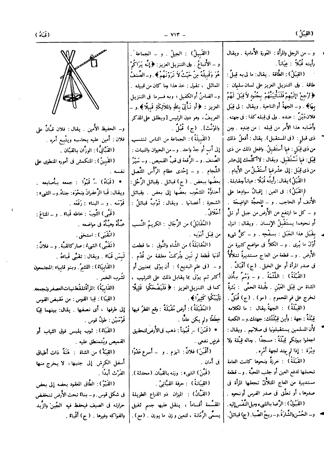 (الْقَبِيلَة) الْجَمَاعَة من النَّاس تنتسب إِلَى أَب أَو جد وَاحِد وَمن الْحَيَوَان والنبات الصِّنْف والرقعة فِي قب الْقَمِيص وسير اللجام وَإِحْدَى عِظَام الرَّأْس الْمُتَّصِل بَعْضهَا بِبَعْض (ج) قبائل وقبائل الرحل أحناؤه المشعوب بَعْضهَا إِلَى بعض وقبائل الشَّجَرَة أَغْصَانهَا وَيُقَال ثوب قبائل أَخْلَاق