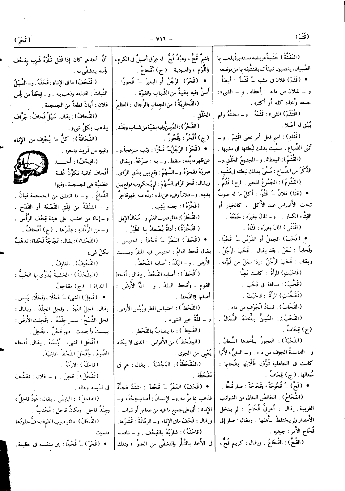 (القحف) أحد أقحاف ثَمَانِيَة تكون علبة عظمية هِيَ الجمجمة وفيهَا الدِّمَاغ وَمَا انْفَلق من الجمجمة فَبَان والفلقة من فلق الْقَصعَة أَو الْقدح وإناء من خشب على هَيْئَة قحف الرَّأْس وَمن الرمانة قشرها (ج) أقحاف