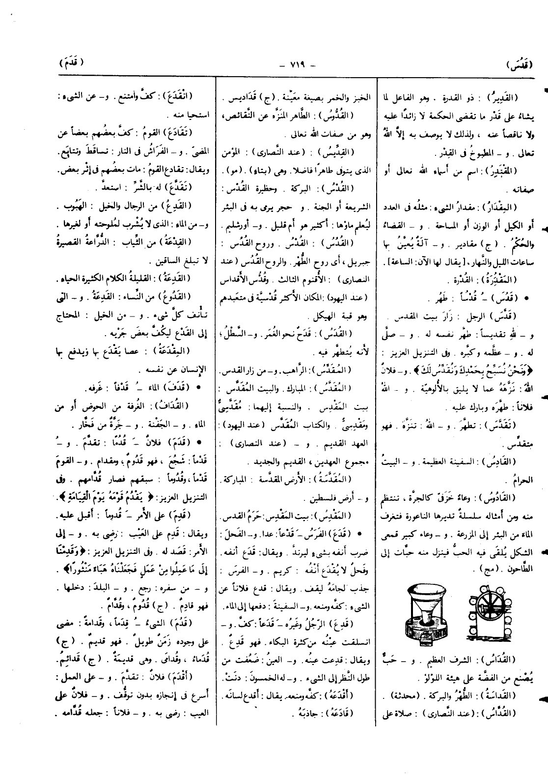 (الْقُدس) الْقُدس وروح الْقُدس جِبْرِيل أَي روح الطُّهْر وَالروح الْقُدس (عِنْد النَّصَارَى) الأقنوم الثَّالِث وَقدس الأقداس (عِنْد الْيَهُود) الْمَكَان الْأَكْثَر قدسية فِي متعبدهم وَهُوَ قبَّة الهيكل