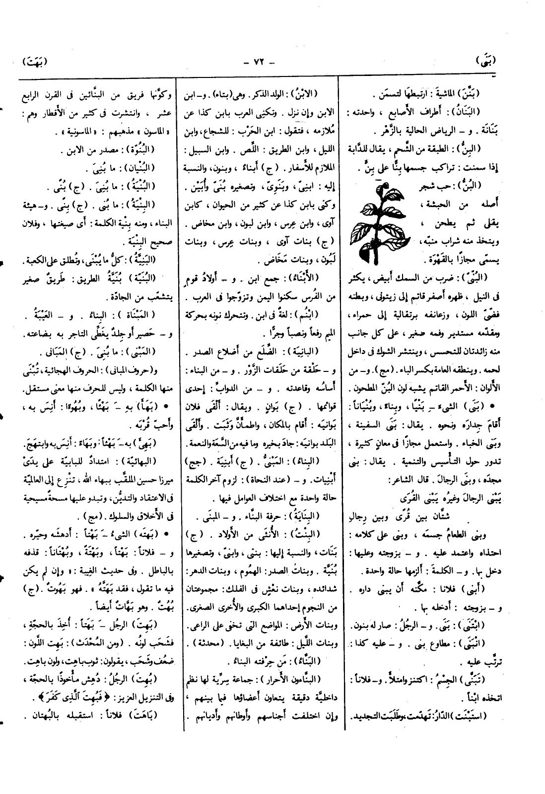 (الابْن) الْوَلَد الذّكر وَهِي (بتاء) وَابْن الابْن وَإِن نزل وتكني الْعَرَب بِابْن كَذَا عَن ملازمه فَتَقول ابْن الْحَرْب للشجاع وَابْن اللَّيْل وَابْن الطَّرِيق اللص وَابْن السَّبِيل الملازم للأسفار (ج) أَبنَاء وبنون وَالنِّسْبَة إِلَيْهِ ابْني وبنوي وتصغيره بني وَأبين وكني بِابْن كَذَا عَن كثير من الْحَيَوَان كَابْن آوى وَابْن عرس وَابْن لبون وَابْن مَخَاض (ج) بَنَات آوى وَبَنَات عرس وَبَنَات لبون وَبَنَات مَخَاض