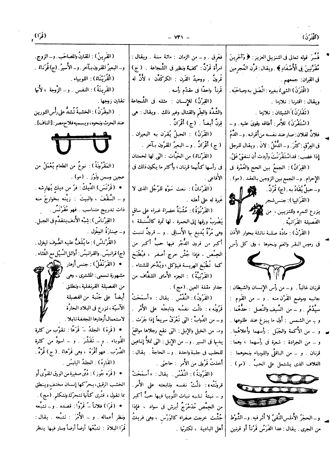 (الْقرن) مَادَّة صلبة ناتئة بجوار الْأذن فِي رُؤُوس الْبَقر وَالْغنم وَنَحْوهَا وَفِي كل رَأس قرنان غَالِبا وَمن رَأس الْإِنْسَان والشيطان جَانِبه وَمَوْضِع الْقرن مِنْهُ وَمن الْقَوْم سيدهم وَمن السَّيْف والنصل حدهما وَمن الشَّمْس أول مَا يبزغ عِنْد طُلُوعهَا وَمن الأكمة والجبل رأسهما وأعلاهما وَمن الجرادة شَعْرَة فِي رأسهما وهما قرنان وَمن الباقلى واللوبياء وَنَحْوهمَا الغلاف الَّذِي يشْتَمل على الْحبّ (مو) وَالْحجر الأملس النقي لَا أثر فِيهِ والشوط من الجري يُقَال عدا الْفرس قرنا أَو قرنين فعرق وَمن الزَّمَان مائَة سنة وَيُقَال امْرَأَة قرن كُفْء وَنَظِير فِي الشجَاعَة (ج) قُرُون ووحيد الْقرن الكركدن لِأَن لَهُ قرنا وَاحِدًا فِي مقدم رَأسه