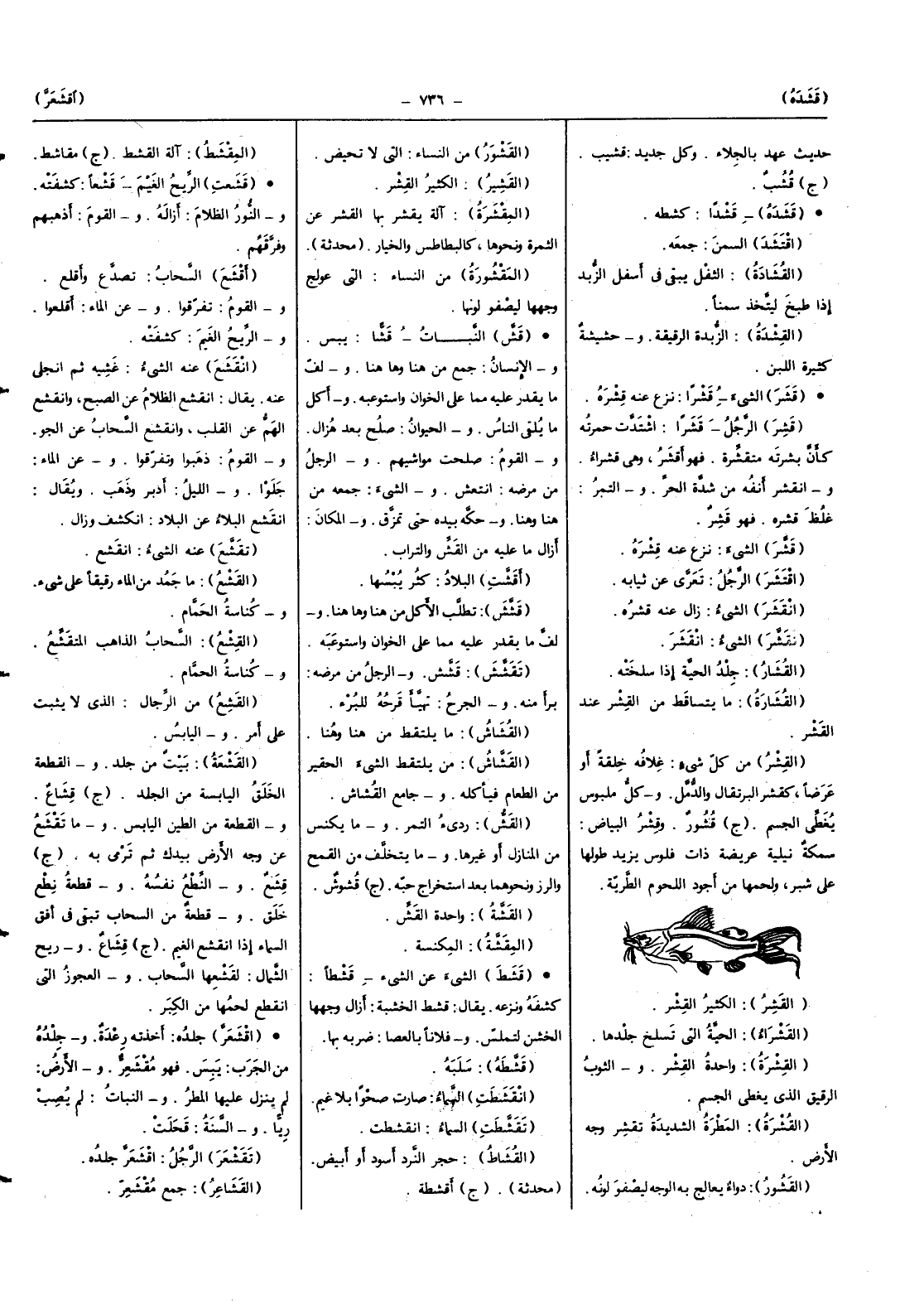 (قشر) الرجل قشرا اشتدت حمرته كَأَن بَشرته متقشرة فَهُوَ أقشر وَهِي قشراء وانقشر أَنفه من شدَّة الْحر وَالتَّمْر غلظ قشره فَهُوَ قشر
