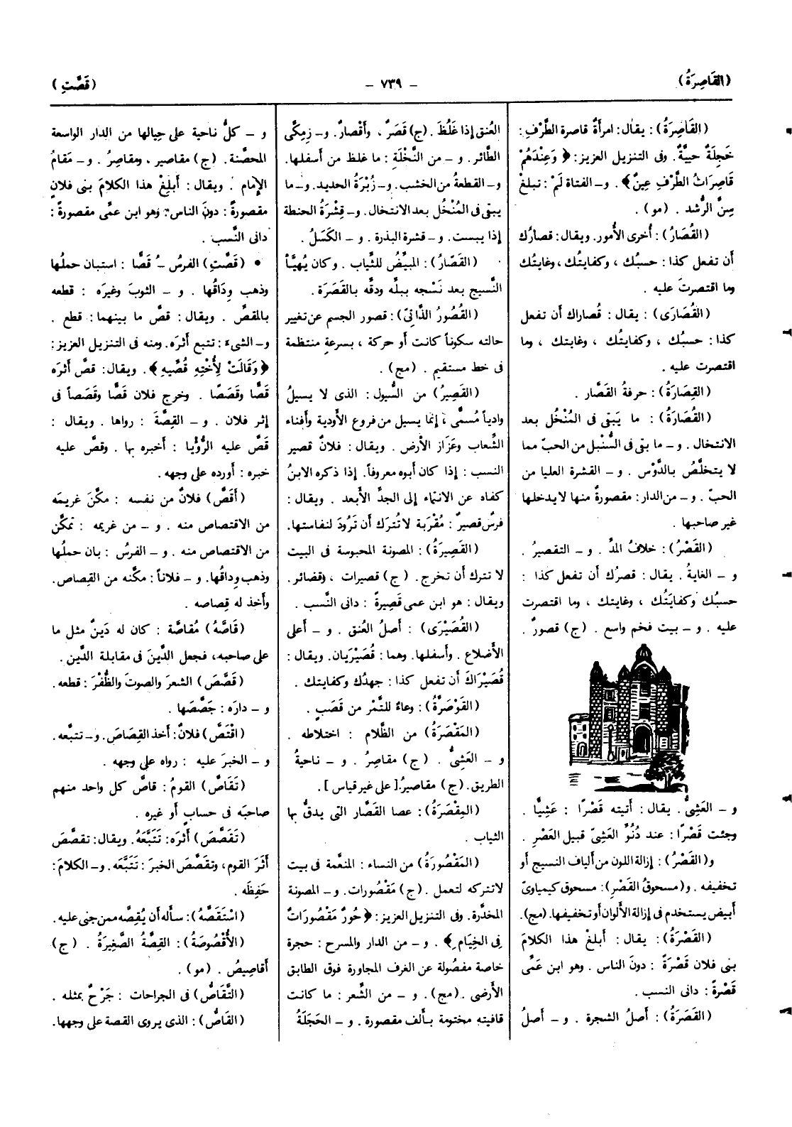 (القصرة) أصل الشَّجَرَة وأصل الْعُنُق إِذا غلظ (ج) قصر وأقصار وزمكي الطَّائِر وَمن النَّخْلَة مَا غلظ من أَسْفَلهَا والقطعة من الْخشب وزبرة الْحَدِيد وَمَا يبْقى فِي المنخل بعد الانتخال وقشرة الْحِنْطَة إِذا يَبِسَتْ وقشرة البذرة والكسل