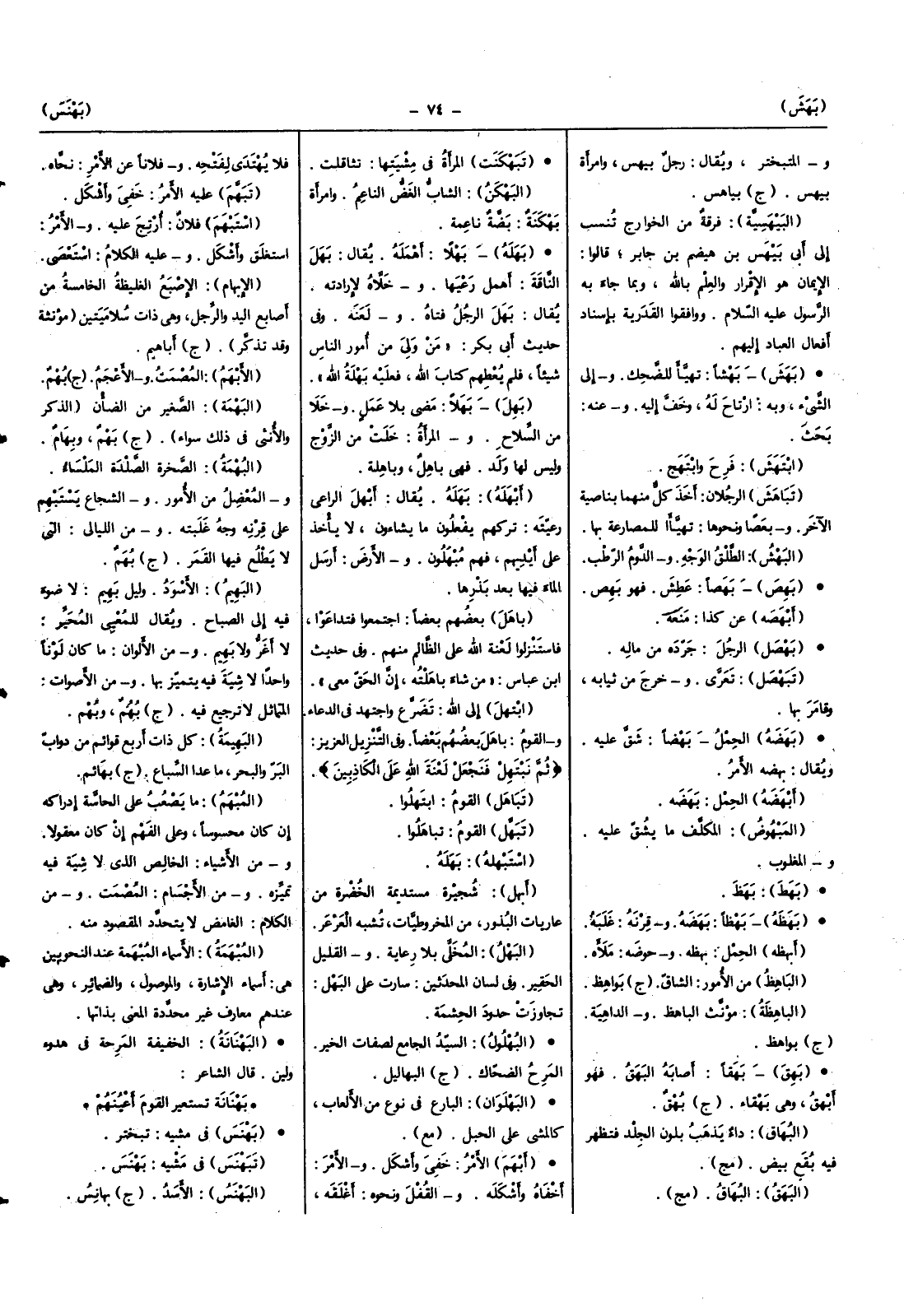 (بهل) بهلا مضى بِلَا عمل وخلا من السِّلَاح وَالْمَرْأَة خلت من الزَّوْج وَلَيْسَ لَهَا ولد فَهِيَ بَاهل وباهلة