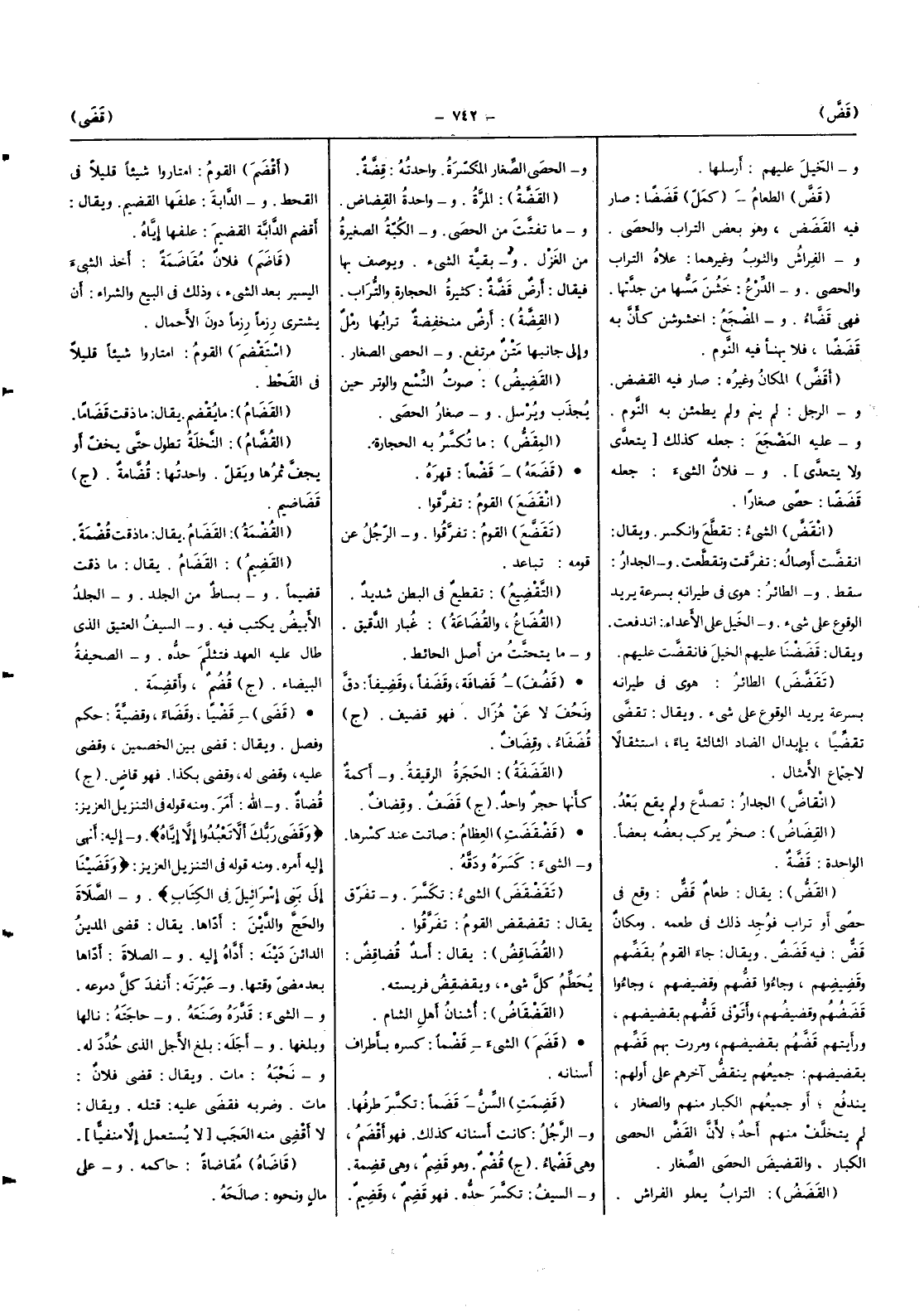 (القض) يُقَال طَعَام قض وَقع فِي حَصى أَو تُرَاب فَوجدَ ذَلِك فِي طعمه وَمَكَان قض فِيهِ قضض وَيُقَال جَاءَ الْقَوْم بقضهم وقضيضهم وجاؤوا قضهم وقضيضهم وجاؤوا قضضهم وقضيضهم وأتوني قضهم بقضيضهم ورأيتهم قضهم بقضيضهم ومررت بهم قضهم بقضيضهم جَمِيعهم ينْقض آخِرهم على أَوَّلهمْ ينْدَفع أَو جَمِيعهم الْكِبَار مِنْهُم وَالصغَار لم يتَخَلَّف مِنْهُم أحد لِأَن القض الْحَصَى الْكِبَار والقضيض الْحَصَى الصغار