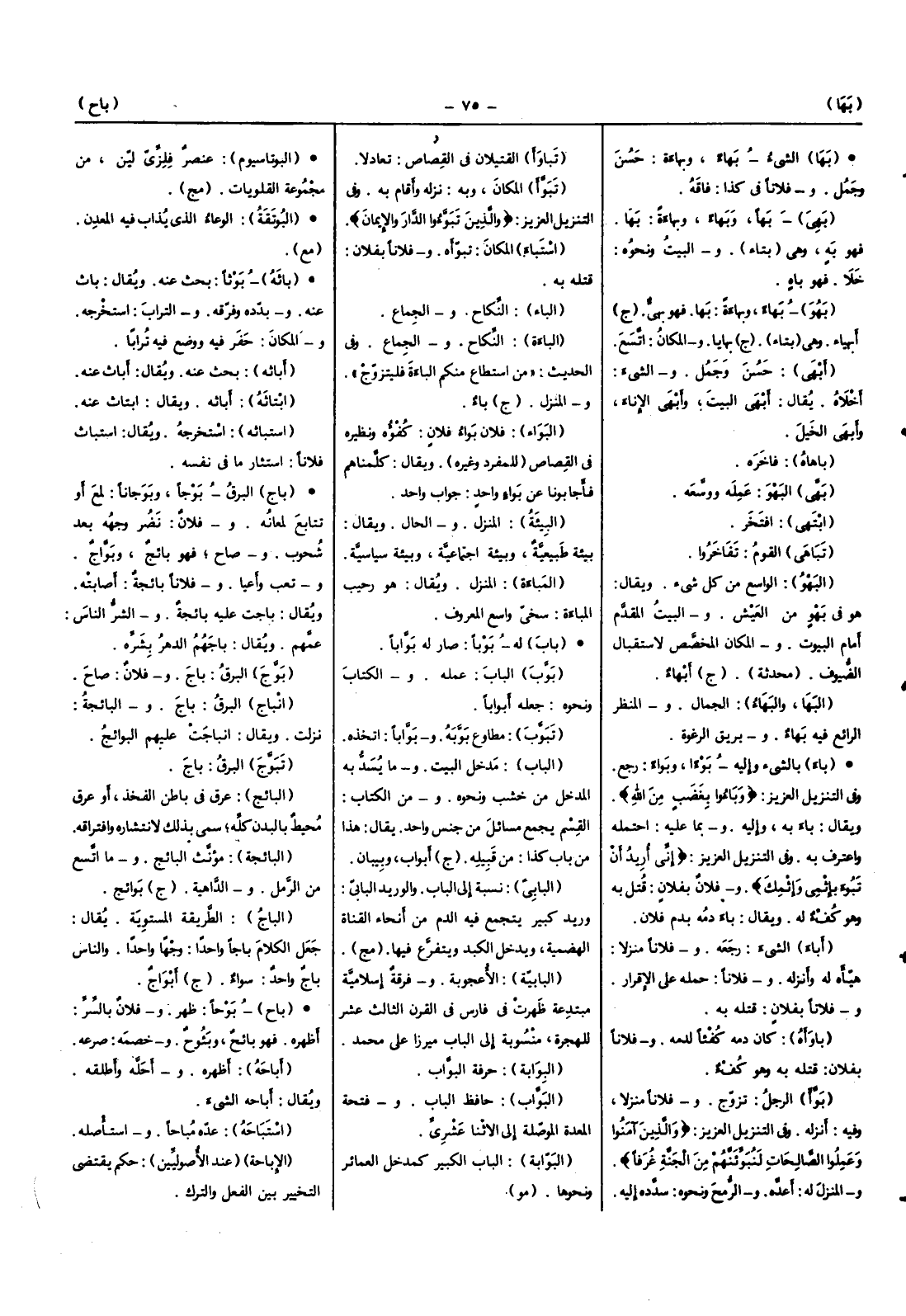 بالشَّيْء وَإِلَيْهِ بوءا وبواء رَجَعَ وَفِي التَّنْزِيل الْعَزِيز {وباؤوا بغضب من الله} وَيُقَال بَاء بِهِ وَإِلَيْهِ وَبِمَا عَلَيْهِ احتمله واعترف بِهِ وَفِي التَّنْزِيل الْعَزِيز {إِنِّي أُرِيد أَن تبوء بإثمي وإثمك} وَفُلَان بفلان قتل بِهِ وَهُوَ كُفْء لَهُ وَيُقَال بَاء دَمه بِدَم فلَان