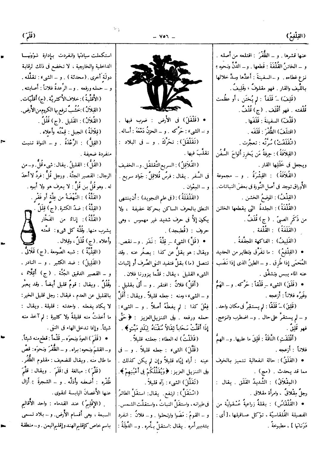 (قلم) مُبَالغَة فِي قلم وَيُقَال قلم ظفره أضعفه وأذله والشجرة أَزَال عَنْهَا الأغصان الْيَابِسَة لتقوى