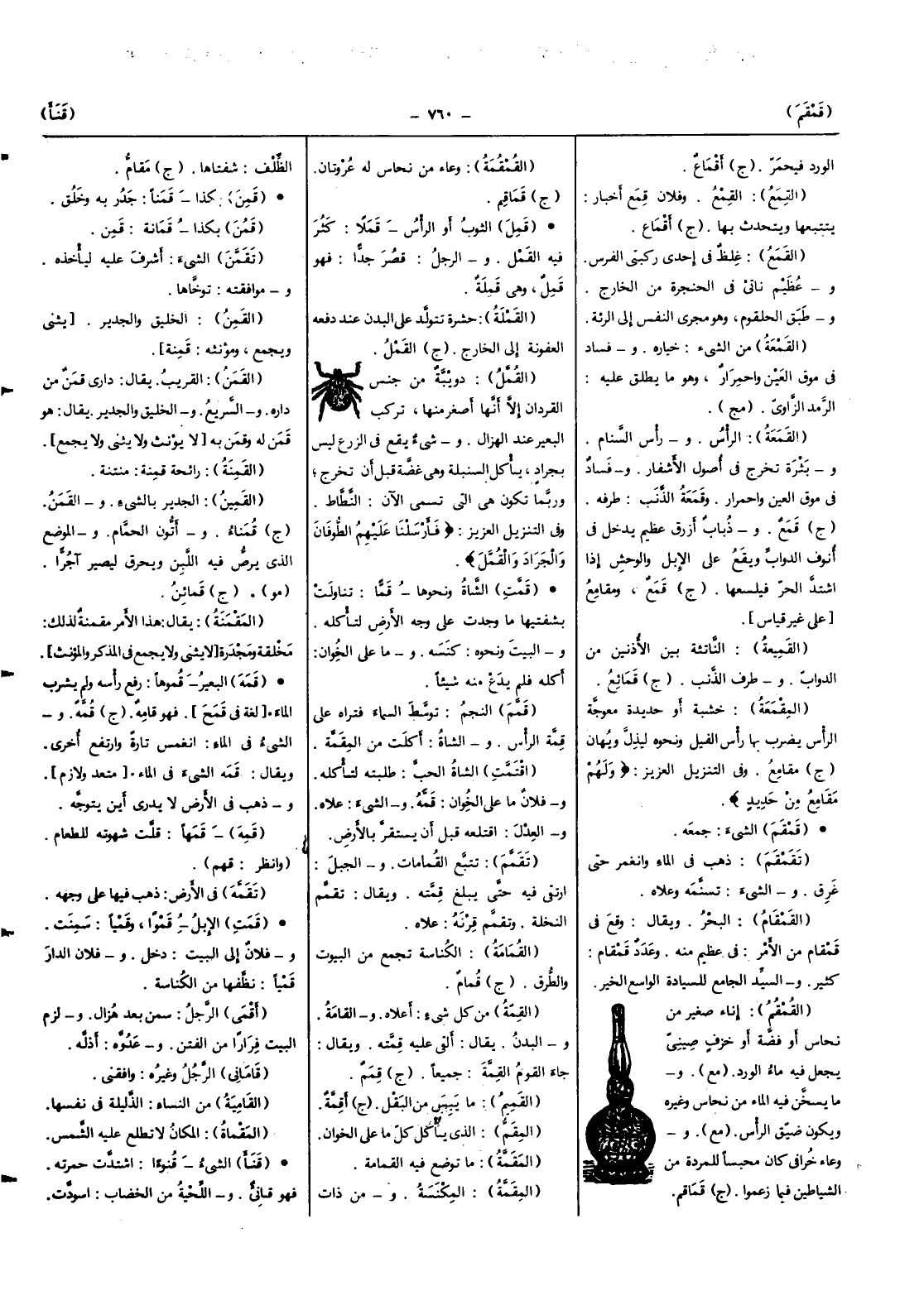 (القمقمة) وعَاء من نُحَاس لَهُ عروتان (ج) قماقم