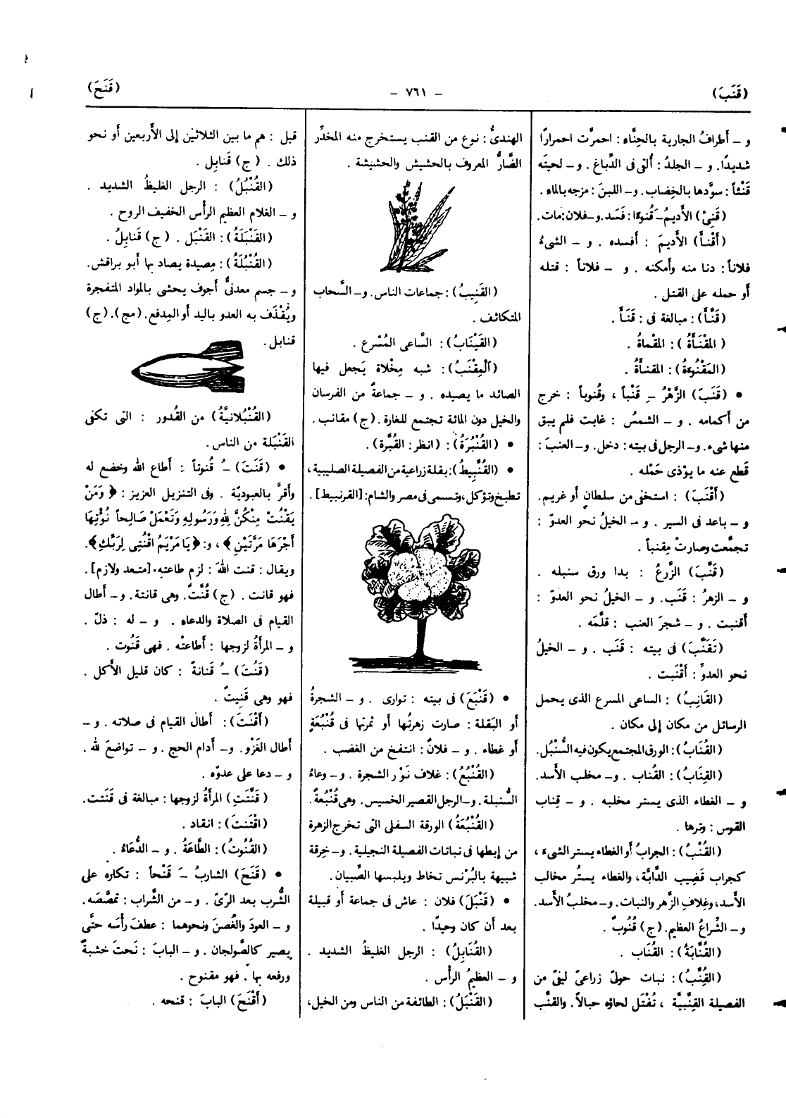 قنوتا أطَاع الله وخضع لَهُ وَأقر بالعبودية وَفِي التَّنْزِيل الْعَزِيز {وَمن يقنت مِنْكُن لله وَرَسُوله وتعمل صَالحا نؤتها أجرهَا مرَّتَيْنِ} و {يَا مَرْيَم اقنتي لِرَبِّك} وَيُقَال قنت الله لزم طَاعَته (مُتَعَدٍّ ولازم) فَهُوَ قَانِت (ج) قنت وَهِي قانتة وَأطَال الْقيام فِي الصَّلَاة وَالدُّعَاء وَله ذل وَالْمَرْأَة لزَوجهَا أَطَاعَته فَهِيَ قنوت