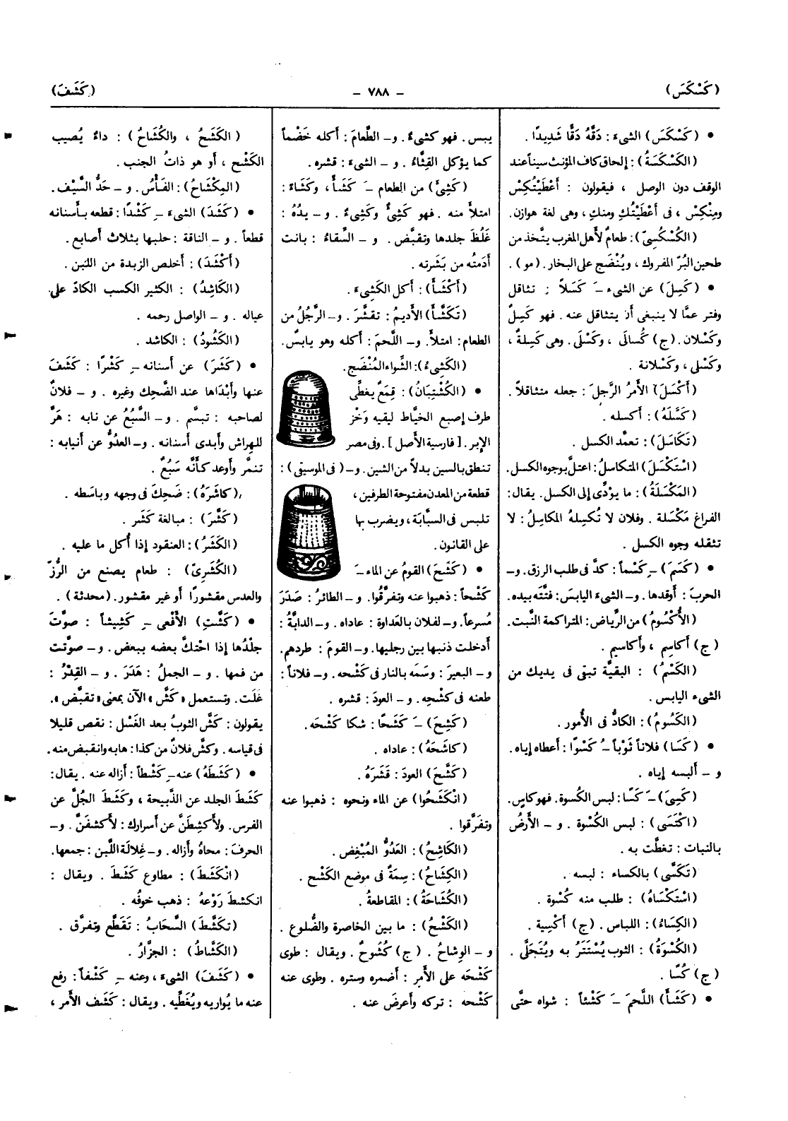 (كشئ) من الطَّعَام كشأ وكشاء امْتَلَأَ مِنْهُ فَهُوَ كشيء وكشيء وَيَده غلظ جلدهَا وتقبض والسقاء بَانَتْ أدمته من بَشرته