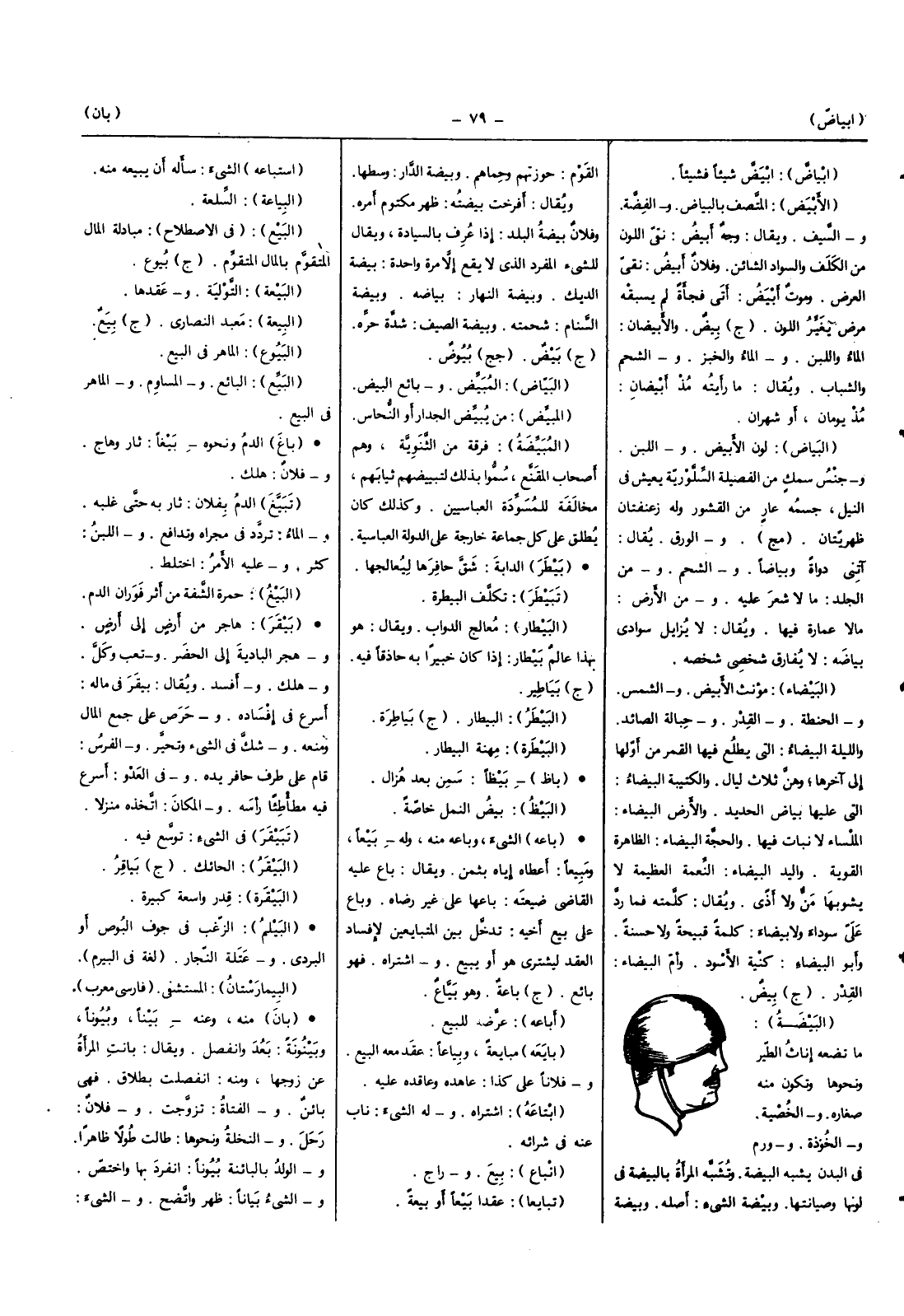 (الْبَيْضَاء) مؤنث الْأَبْيَض وَالشَّمْس وَالْحِنْطَة وَالْقدر وحبالة الصَّائِد وَاللَّيْلَة الْبَيْضَاء الَّتِي يطلع فِيهَا الْقَمَر من أَولهَا إِلَى آخرهَا وَهن ثَلَاث لَيَال والكتيبة الْبَيْضَاء الَّتِي عَلَيْهَا بَيَاض الْحَدِيد وَالْأَرْض الْبَيْضَاء الملساء لَا نَبَات فِيهَا وَالْحجّة الْبَيْضَاء الظَّاهِرَة القوية وَالْيَد الْبَيْضَاء النِّعْمَة الْعَظِيمَة لَا يشوبها من وَلَا أَذَى وَيُقَال كَلمته فَمَا رد عَليّ سَوْدَاء وَلَا بَيْضَاء كلمة قبيحة وَلَا حَسَنَة وَأَبُو الْبَيْضَاء كنية الْأسود وَأم الْبَيْضَاء الْقدر (ج) بيض (الْبَيْضَة) مَا تضعه إناث الطير وَنَحْوهَا وَتَكون مِنْهُ صغاره والخصية والخوذة وورم الْبدن يشبه الْبَيْضَة وتشبه الْمَرْأَة بالبيضة فِي لَوْنهَا وصيانتها وبيضة الشَّيْء أَصله وبيضة الْقَوْم حوزتهم وحماهم وبيضة الدَّار وَسطهَا