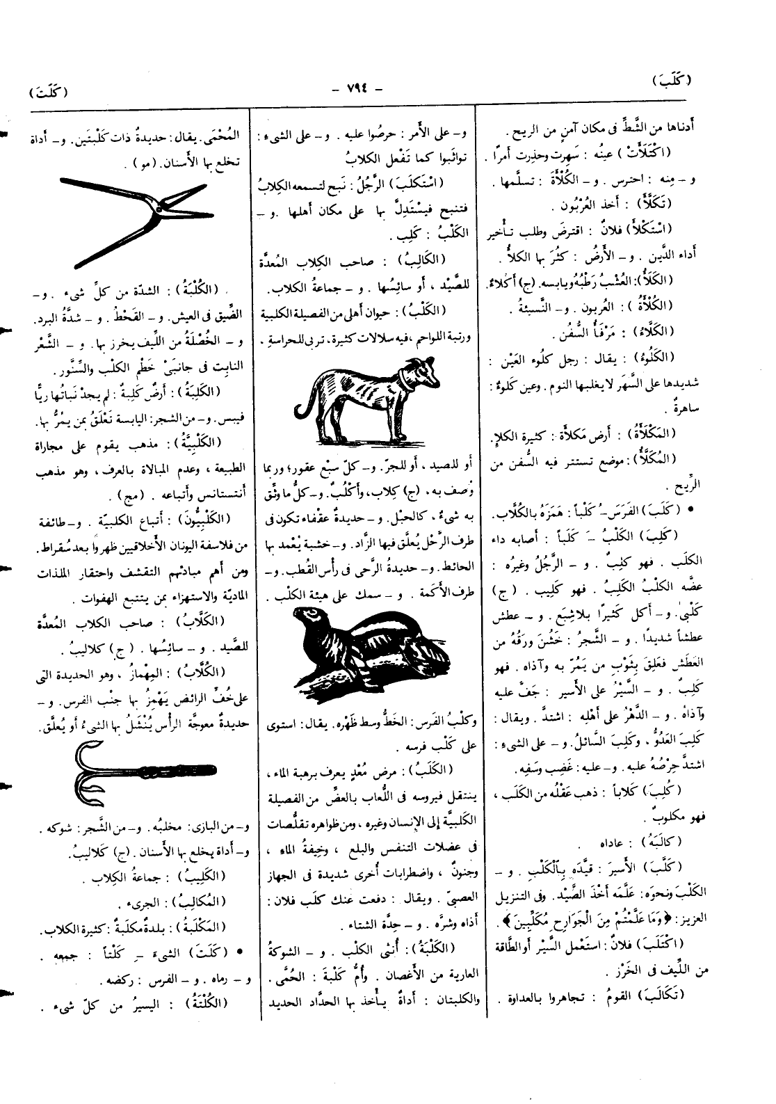 (الكلبة) أُنْثَى الْكَلْب والشوكة الْعَارِية من الأغصان وَأم كلبة الْحمى والكلبتان أَدَاة يَأْخُذ بهَا الْحداد الْحَدِيد المحمى يُقَال حَدِيدَة ذَات كلبتين وأداة تخلع بهَا الْأَسْنَان (مو)
