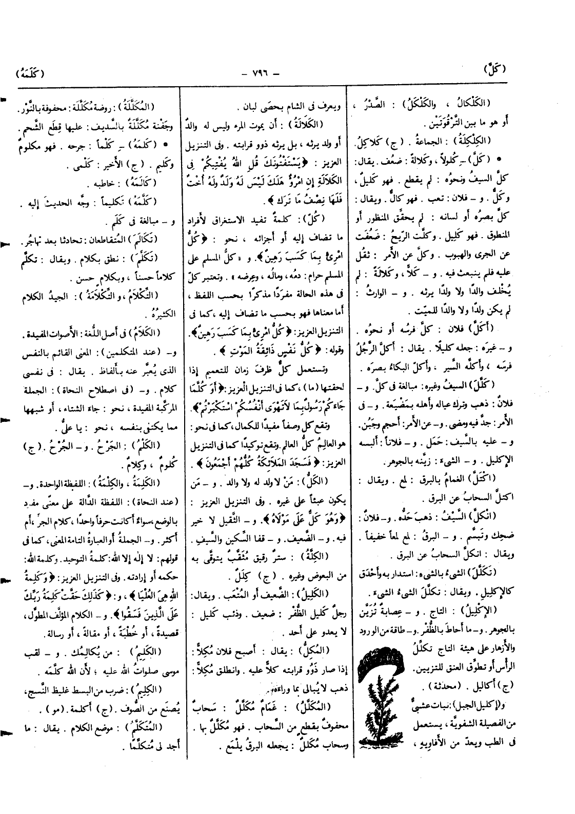 (الْكل) من لَا ولد لَهُ وَلَا وَالِد وَمن يكون عبئا على غَيره وَفِي التَّنْزِيل الْعَزِيز {وَهُوَ كل على مَوْلَاهُ} والثقيل لَا خير فِيهِ والضعيف وَقفا السكين وَالسيف