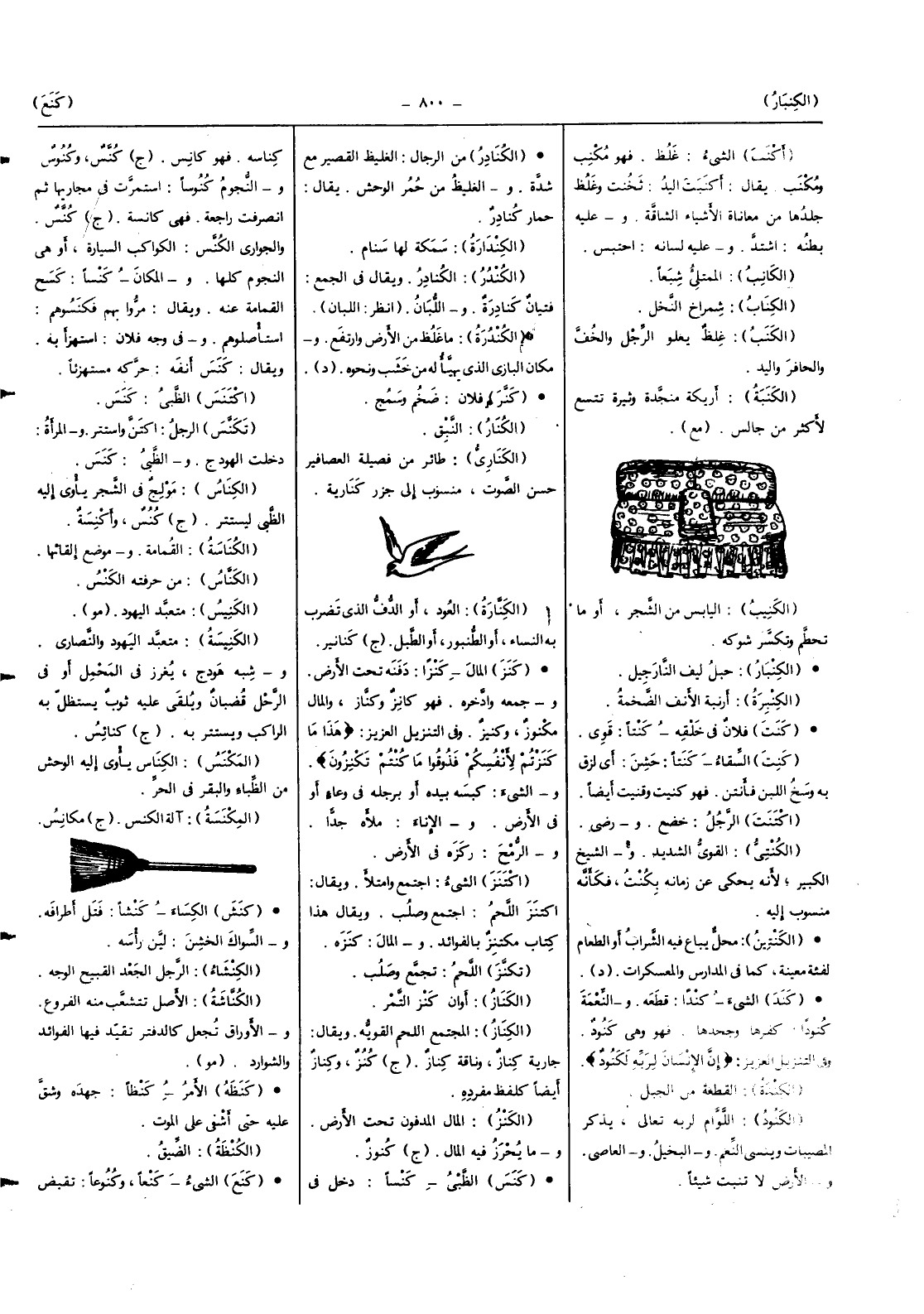 الظبي كنسا دخل فِيهِ كناسه فَهُوَ كانس (ج) كنس وكنوس والنجوم كنوسا استمرت فِي مجاريها ثمَّ انصرفت رَاجِعَة فَهِيَ كانسة (ج) كنس والجواري الكنس الْكَوَاكِب السيارة أَو هِيَ النُّجُوم كلهَا وَالْمَكَان كنسا كسح القمامة عَنهُ وَيُقَال مروا بهم فكنسوهم استأصلوهم وَفِي وَجه فلَان اسْتَهْزَأَ بِهِ وَيُقَال كنس أَنفه حركه مستهزئا