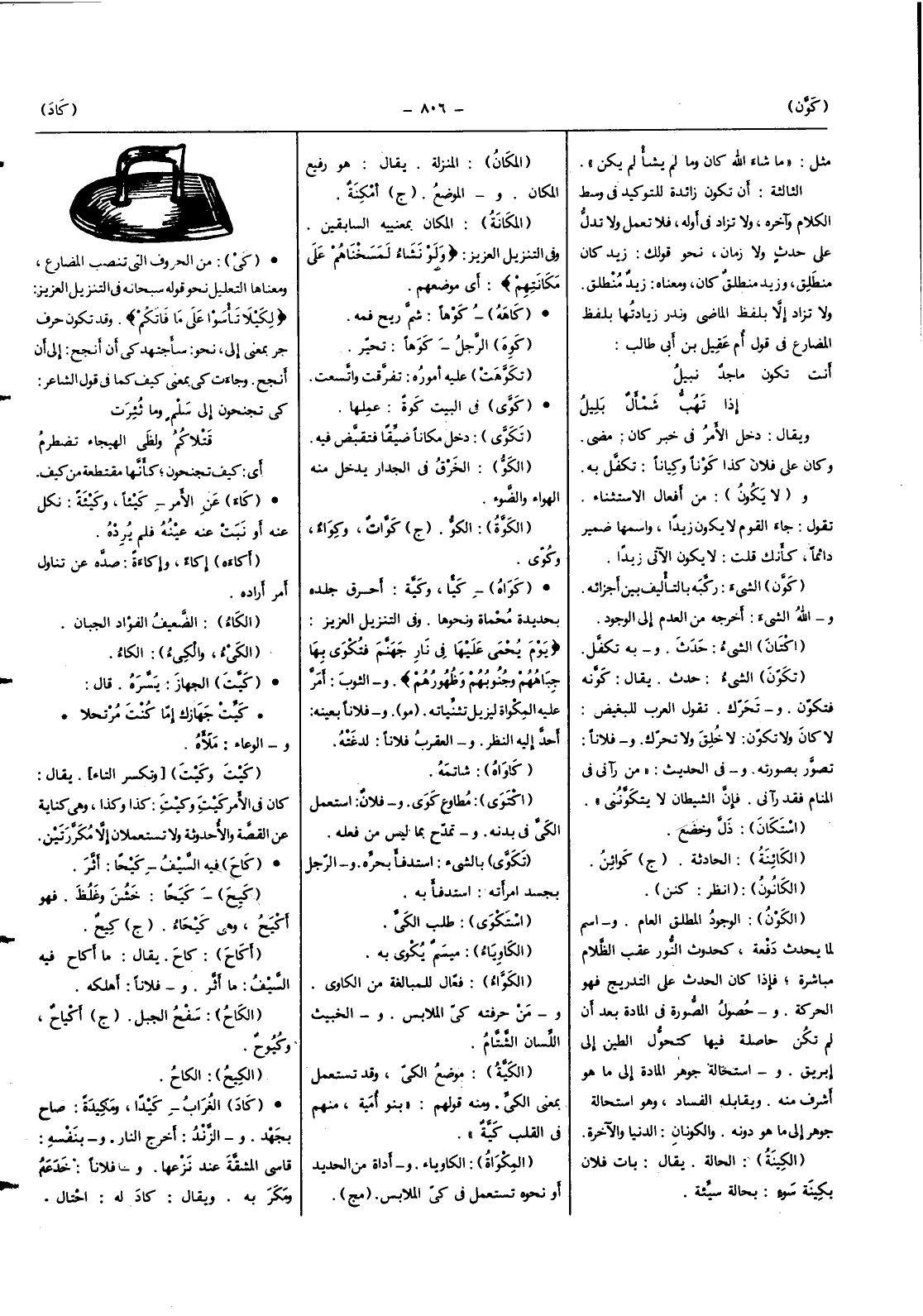 (تكون) الشَّيْء حدث يُقَال كَونه فَتكون وتحرك تَقول الْعَرَب للبغيض لَا كَانَ وَلَا تكون لَا خلق وَلَا تحرّك وَفُلَانًا تصور بصورته وَفِي الحَدِيث (من رَآنِي فِي الْمَنَام فقد رَآنِي فَإِن الشَّيْطَان لَا يتكونني)