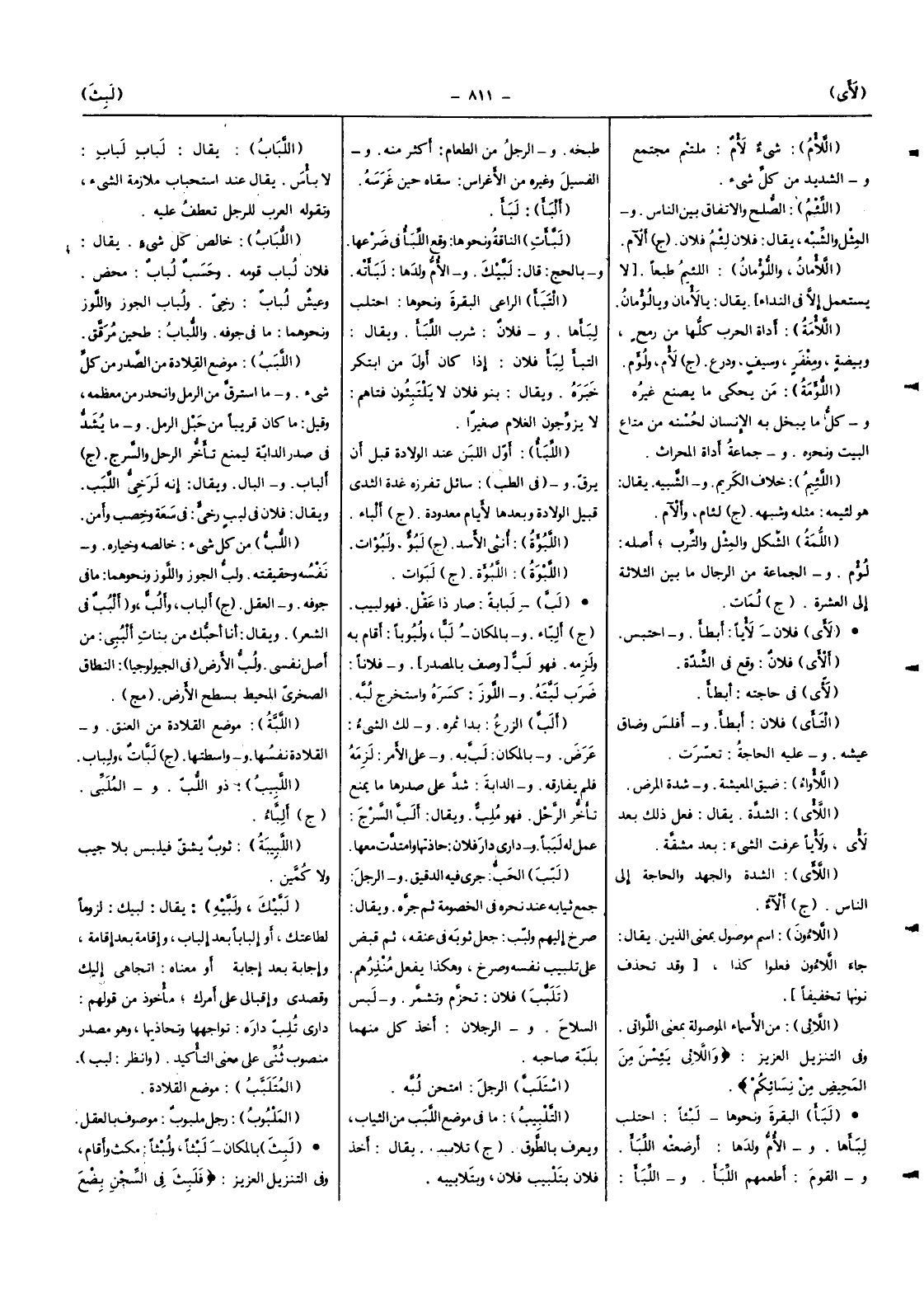 (اللب) من كل شَيْء خالصه وخياره وَنَفسه وَحَقِيقَته ولب الْجَوْز واللوز وَنَحْوهمَا مَا فِي جَوْفه وَالْعقل (ج) ألباب وألب و (ألبب فِي الشّعْر) وَيُقَال أَنا أحبك من بَنَات ألببي من أصل نَفسِي ولب الأَرْض (فِي الجيولوجيا) النطاق الصخري الْمُحِيط بسطح الأَرْض (مج)