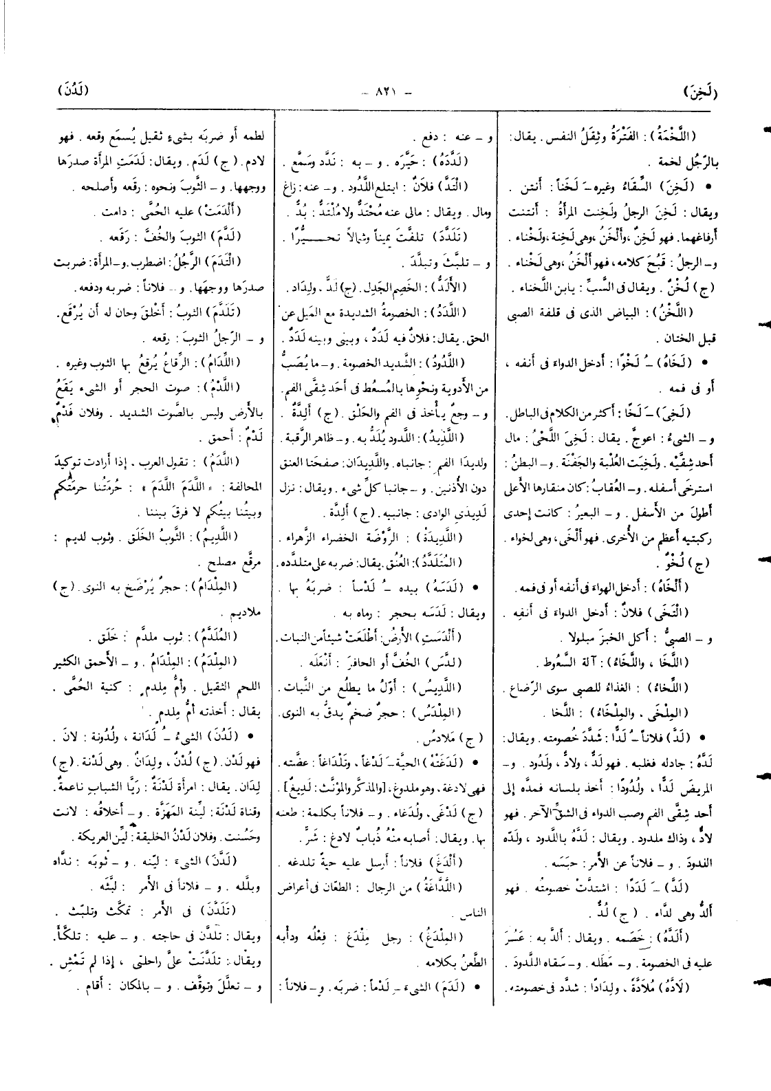 فلَانا لدا شدد خصومته وَيُقَال لده جادله فغلبه فَهُوَ لد ولاد ولدود وَالْمَرِيض لدا ولدودا أَخذ بِلِسَانِهِ فمده إِلَى أحد شقي الْفَم وصب الدَّوَاء فِي الشق الآخر فَهُوَ لاد وَذَاكَ ملدود وَيُقَال لده باللدود وَلَده اللدود وَفُلَانًا عَن الْأَمر حَبسه