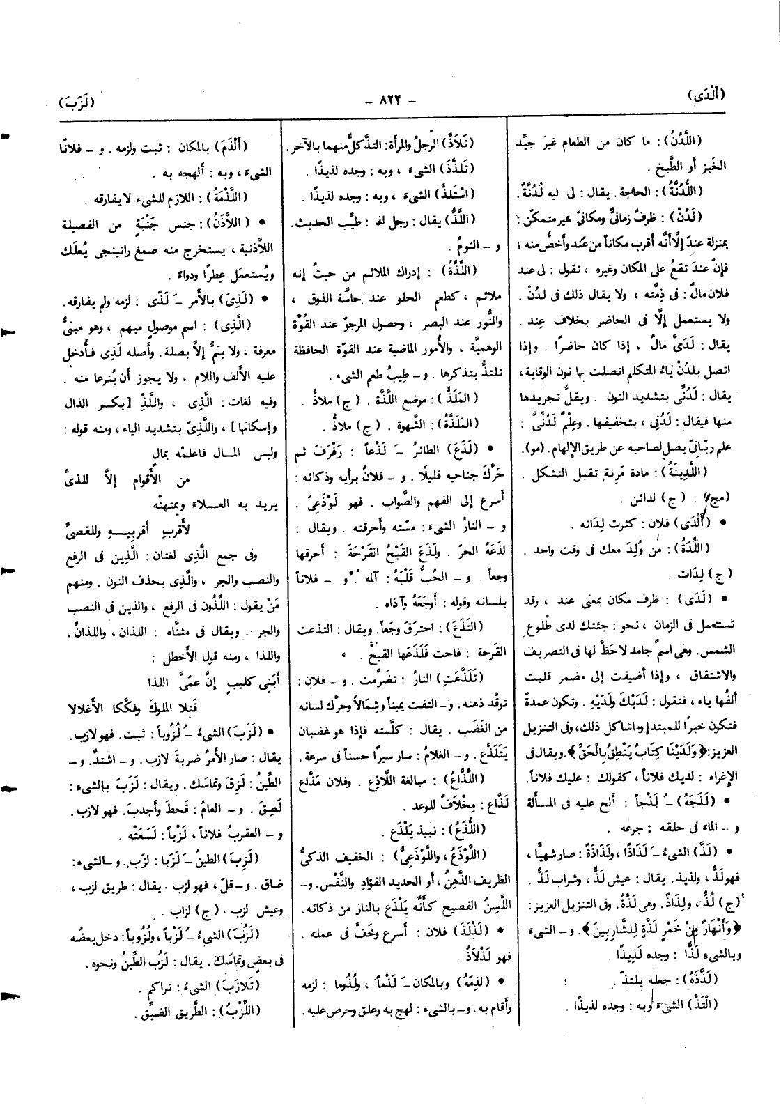 الشَّيْء لذاذا ولذاذة صَار شهيا فَهُوَ لذ ولذيذ يُقَال عَيْش لذ وشراب لذ (ج) لذ ولذاذ وَهِي لَذَّة وَفِي التَّنْزِيل الْعَزِيز {وأنهار من خمر لَذَّة للشاربين} وَالشَّيْء وبالشيء لذا وجده لذيذا