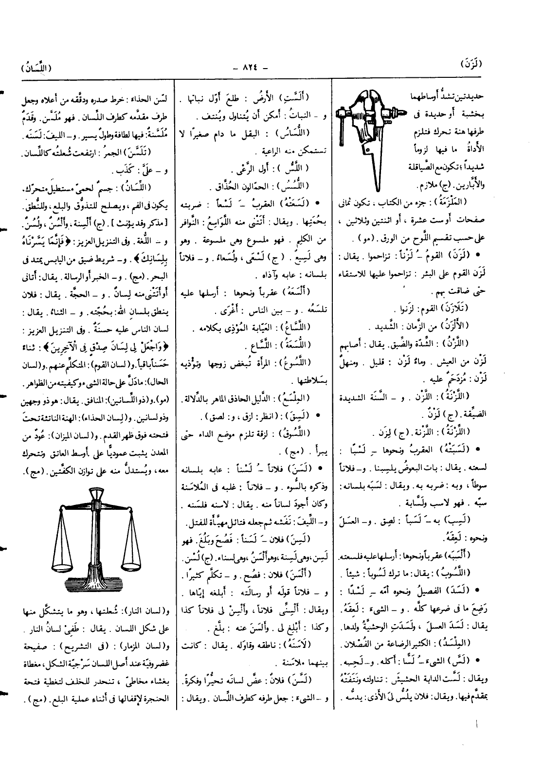 (لسن) فلَان عض لِسَانه تحيرا وفكرة وَالشَّيْء جعل طرفه كطرف اللِّسَان وَيُقَال لسن الْحذاء خرط صَدره ودققه من أَعْلَاهُ وَجعل طرف مُقَدّمَة 30 31 32 33 34 35 36 37 (مو) و (ذُو اللسانين) الْمُنَافِق يُقَال هُوَ ذُو وَجْهَيْن وَذُو لسانين (لِسَان الْحذاء) الهنة الناتئة تَحت فَتحته فَوق ظهر الْقدَم ولسان الْمِيزَان عود من الْمَعْدن يثبت عموديا على أَوسط العاتق وتتحرك مَعَه ويستدل مِنْهُ على توازن الكفتين (مج) و (لِسَان النَّار) شعلتها وَهُوَ مَا يتشكل مِنْهَا على شكل اللِّسَان يُقَال طفيء لِسَان النَّار