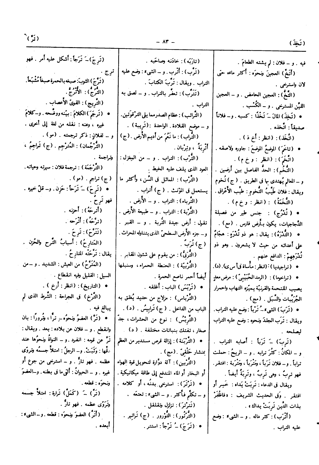 (ترب) تربا أَصَابَهُ التُّرَاب وَالْمَكَان كثر ترابه وَالرِّيح حملت تُرَابا وَفُلَان تربا ومتربا ومتربة افْتقر فَهُوَ ترب وَهِي ترب وتربة أَيْضا