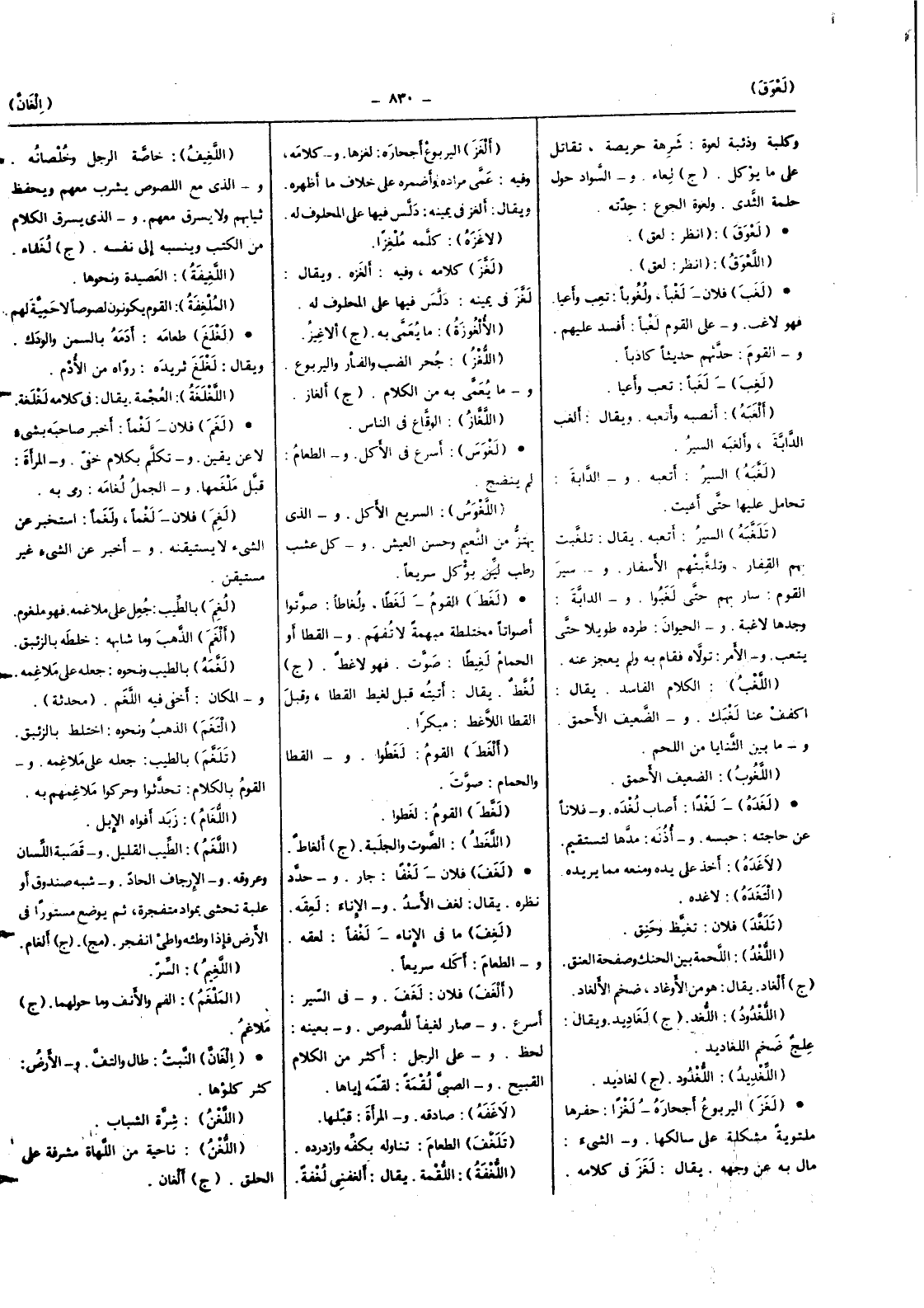(ألغف) فلَان لغف وَفِي السّير أسْرع وَصَارَ لغيفا للصوص وبعينه لحظ وعَلى الرجل أَكثر من الْكَلَام الْقَبِيح وَالصَّبِيّ لقمه إِيَّاهَا