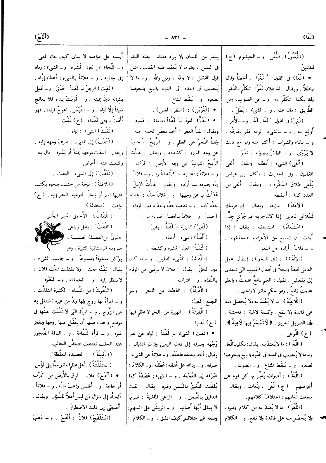 الشَّيْء لفتا لواه على غير وَجهه وَصَرفه إِلَى ذَات الْيَمين وَذَات الشمَال يُقَال أَخذ بعنقه فلفته وَفُلَانًا عَن الشَّيْء صرفه ورداءه على عُنُقه عطفه وَالْكَلَام صرفه إِلَى العجمة وَالشَّيْء عصده كَمَا يلفت الدَّقِيق بالسمن وَغَيره يُقَال لفت الدَّقِيق بالسمن والراعي الْمَاشِيَة ضربهَا لَا يُبَالِي أَيهَا أصَاب والريش على السهْم وَضعه غير متلائم كَيفَ اتّفق وَالْكَلَام أرْسلهُ على عواهنه لَا يُبَالِي كَيفَ جَاءَ الْمَعْنى واللحاء عَن الْعود قشره وَالشَّيْء رَمَاه إِلَى جَانِبه وَفُلَانًا بالشَّيْء أعطَاهُ إِيَّاه