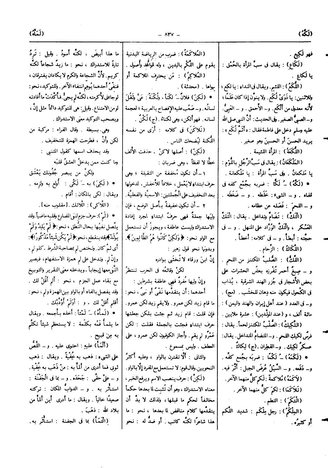 (اللكع) اللَّئِيم يُقَال فِي النداء يَا لكع وللاثنين يَا ذَوي لكع وَلَا ينون إِذا كَانَ علما لِأَنَّهُ معدول من ألكع والأحمق والعيي وَالصَّبِيّ الصَّغِير وَفِي الحَدِيث أَن النَّبِي صلى الله عَلَيْهِ وَسلم دخل على فَاطِمَة فَقَالَ (أَثم لكع) يُرِيد الْحسن أَو الْحُسَيْن وَهُوَ صَغِير