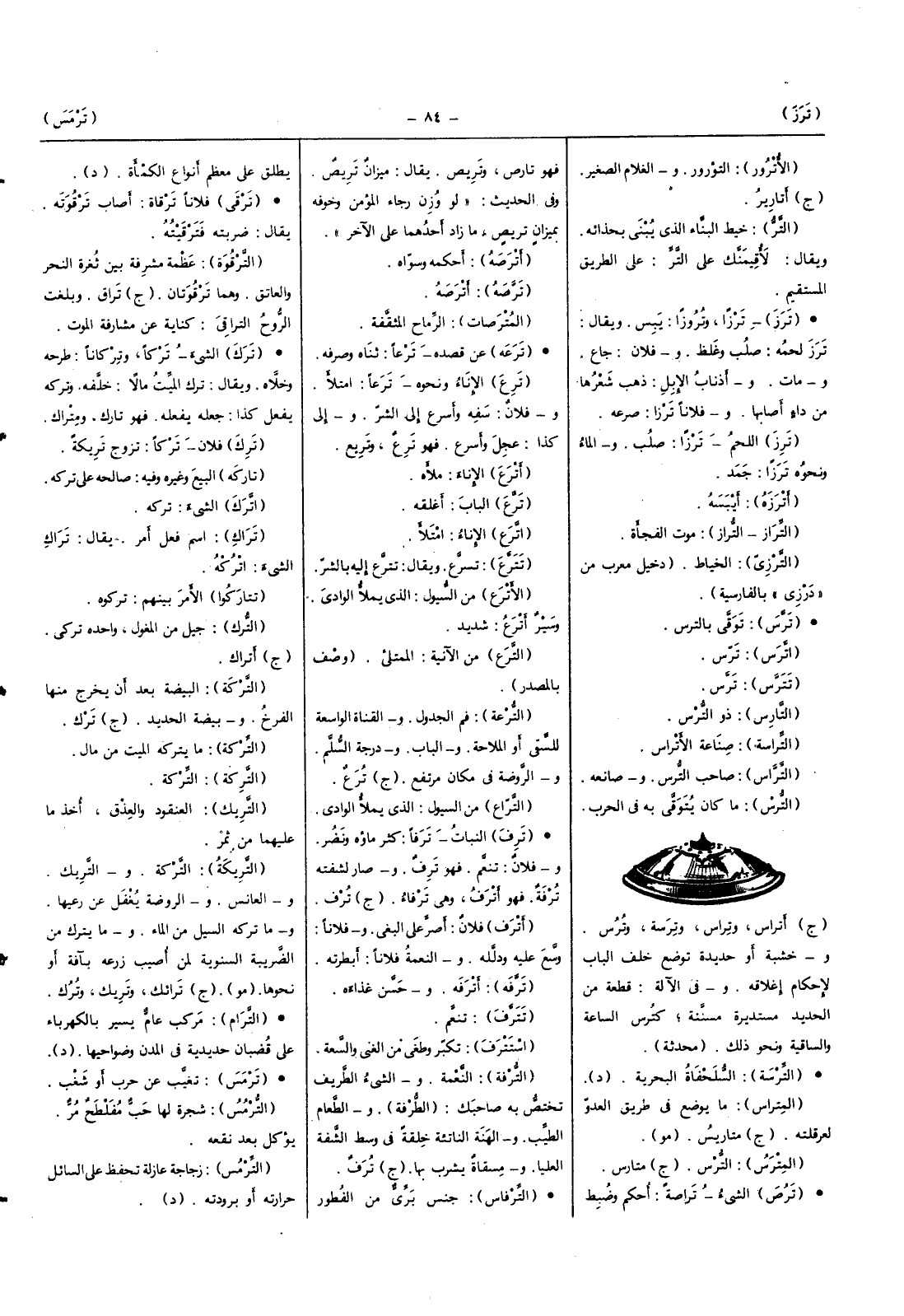 ترزا وتروزا يبس وَيُقَال ترز لَحْمه صلب وَغلظ وَفُلَان جَاع وَمَات وأذناب الْإِبِل ذهب شعرهَا من دَاء أَصَابَهَا وَفُلَانًا ترزا صرعه