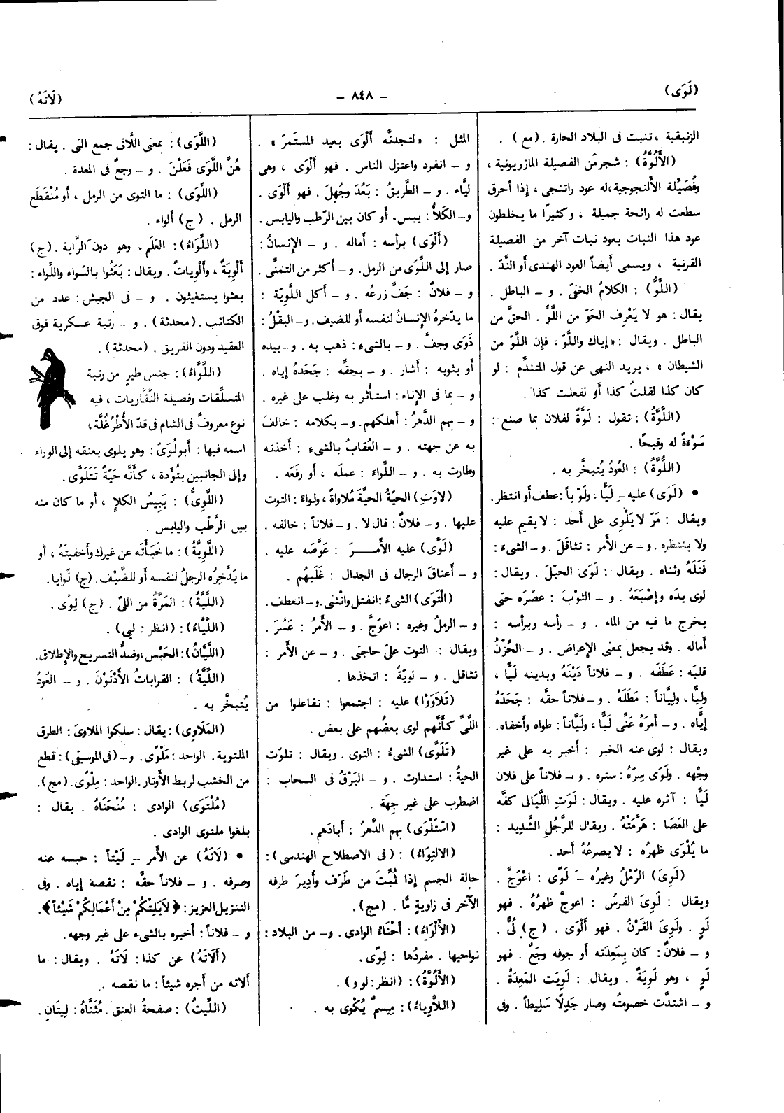 عَلَيْهِ ليا ولويا عطف أَو انْتظر وَيُقَال مر لَا يلوي على أحد لَا يُقيم عَلَيْهِ وَلَا ينتظره وَعَن الْأَمر تثاقل وَالشَّيْء فتله وثناه وَيُقَال لوى الْحَبل وَيُقَال لوى يَده وإصبعه وَالثَّوْب عصره حَتَّى يخرج مَا فِيهِ من المَاء وَرَأسه بِرَأْسِهِ أماله وَقد يَجْعَل بِمَعْنى الْإِعْرَاض والحزن قلبه عطفه وَفُلَانًا دينه وبدينه ليا وليا وليانا مطله وَفُلَانًا حَقه جَحده إِيَّاه وَأمره عَنى ليا وليانا طواه وأخفاه وَيُقَال لوى عَنهُ الْخَبَر أخبر بِهِ على غير وَجهه ولوى سره ستره وَفُلَانًا على فلَان ليا آثره عَلَيْهِ وَيُقَال لوت اللَّيَالِي كَفه على الْعَصَا هرمته وَيُقَال للرجل الشَّديد مَا يلوي ظَهره لَا يصرعه أحد