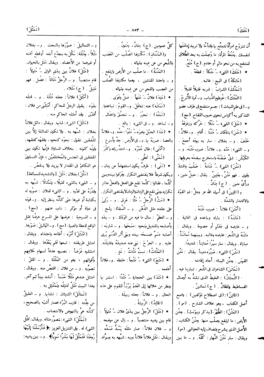 الرجل بَين يَدي فلَان مثولا قَامَ بَين يَدَيْهِ منتصبا وَزَالَ عَن مَوْضِعه وَفُلَان فلَانا صَار مثله يسد مسده وَيُقَال مثل فلَانا فلَانا وَبِه شبهه بِهِ وسواه والتماثيل صورها بالنحت وبفلان مثلا ومثلة نكل بِهِ بجدع أَنفه أَو قطع أُذُنه أَو غَيرهمَا من الْأَعْضَاء وَيُقَال مثل بِالْحَيَوَانِ