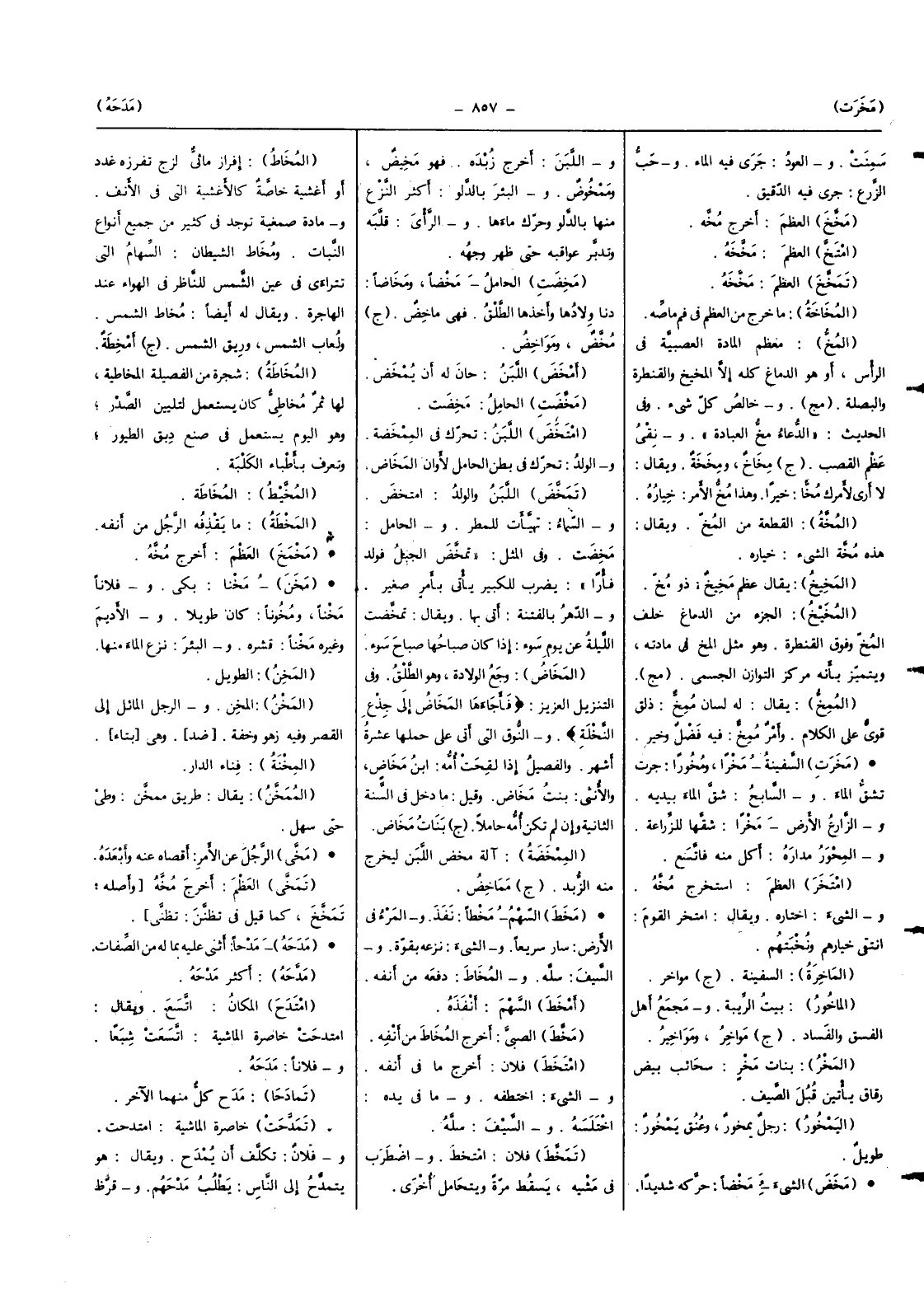 مخنا بَكَى وَفُلَانًا مخنا ومخونا كَانَ طَويلا والأديم وَغَيره مخنا والبئر نزع المَاء مِنْهَا