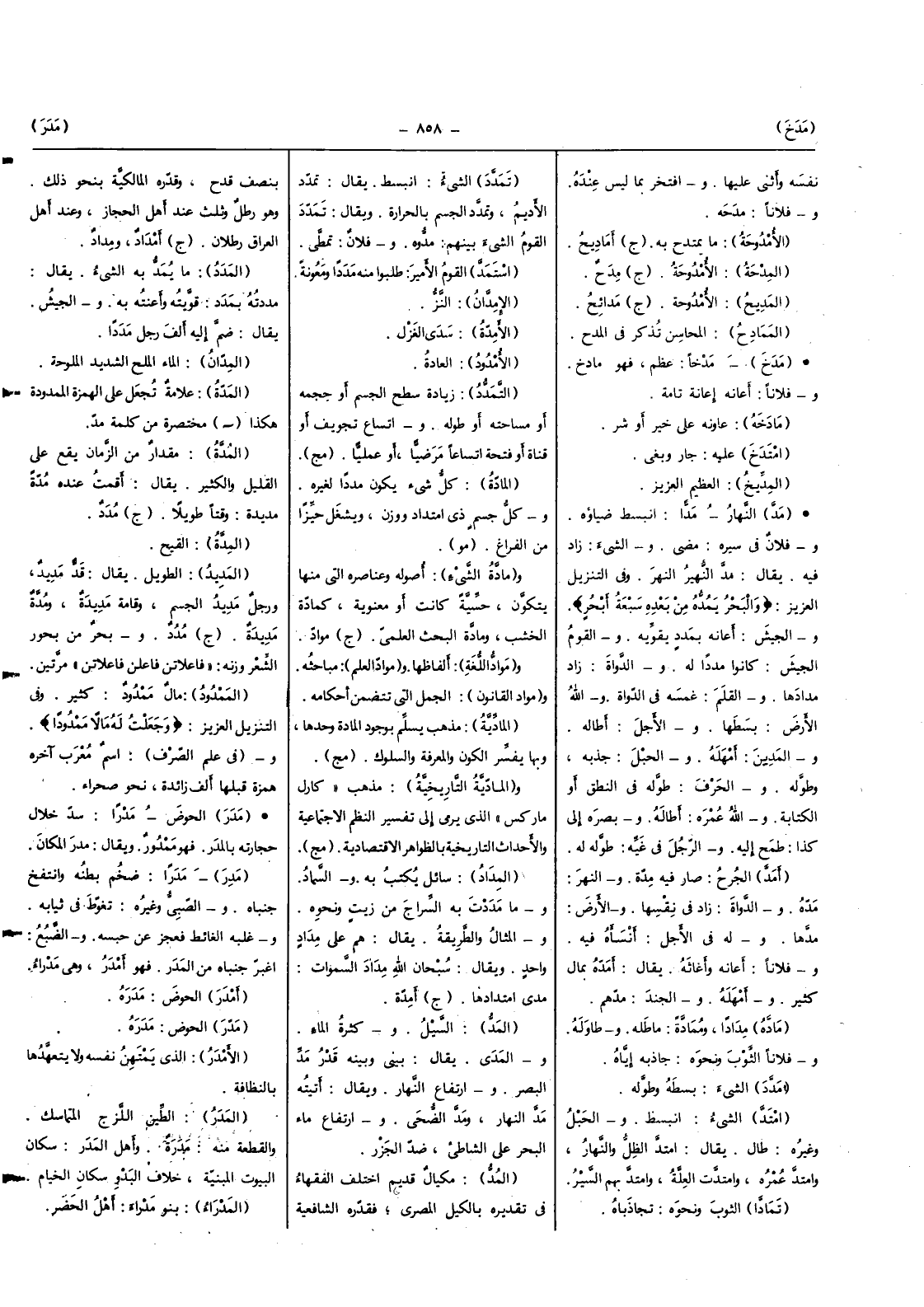 (الْمَدّ) السَّيْل وَكَثْرَة المَاء والمدى يُقَال بيني وَبَينه قدر مد الْبَصَر وارتفاع النَّهَار وَيُقَال أَتَيْته مد النَّهَار وَمد الضُّحَى وارتفاع مَاء الْبَحْر على الشاطئ ضد الجزر