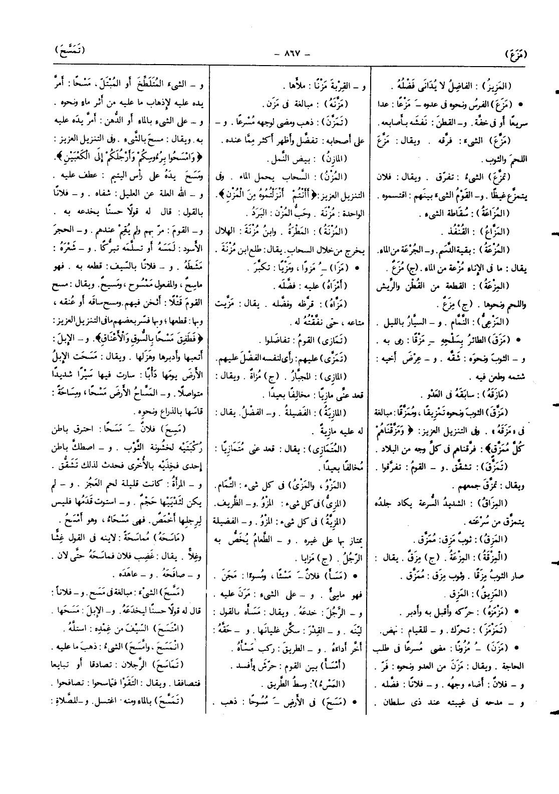 مزونا مضى مسرعا فِي طلب الْحَاجة وَيُقَال مزن من الْعَدو وَنَحْوه فر وَفُلَان أَضَاء وَجهه وَفُلَانًا فَضله ومدحه فِي غيبته عِنْد ذِي سُلْطَان والقرية مزنا ملأها