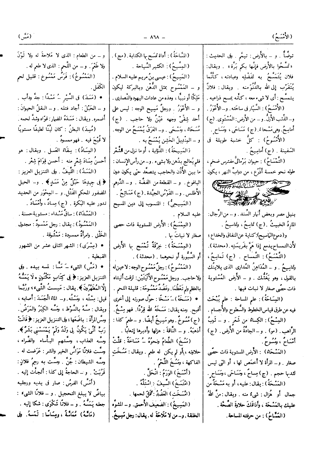 (التمسح) التمساح (ج) تماسح وتماسيح والمداهن المداري الَّذِي يلاينك بالْقَوْل وَهُوَ يغشك وَالْأَرْض المستوية ذَات حَصى صغَار لَا نَبَات فِيهَا