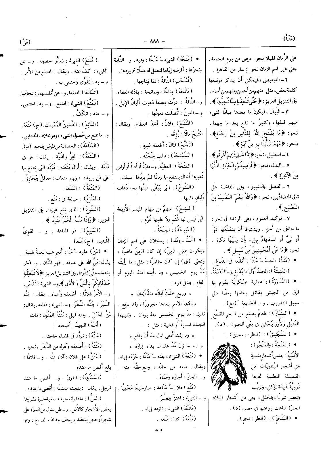 عَلَيْهِ منا أنعم عَلَيْهِ نعْمَة طيبَة يُقَال من الله على عباده فَهُوَ المنان وفخر بنعمته حَتَّى كدرها وَفِي التَّنْزِيل الْعَزِيز {لَا تُبْطِلُوا صَدقَاتكُمْ بالمن والأذى} وَالشَّيْء نقص وَالْأَمر فلَانا أضعفه وأعياه يُقَال مِنْهُ السّير وَمِنْه السّفر وَالشَّيْء قطعه يُقَال من الْحَبل وَمِنْه قيل منته الْمنون مَاتَ