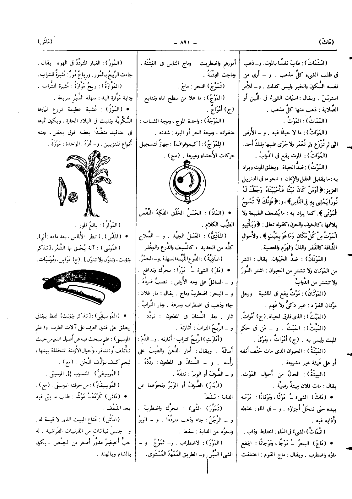 (الْمَوْت) ضد الْحَيَاة وَيُطلق الْمَوْت وَيُرَاد بِهِ مَا يُقَابل الْعقل وَالْإِيمَان نَحْو مَا فِي التَّنْزِيل الْعَزِيز {أَو من كَانَ مَيتا فأحييناه وَجَعَلنَا لَهُ نورا يمشي بِهِ فِي النَّاس} و {فَإنَّك لَا تسمع الْمَوْتَى} كَمَا يُرَاد بِهِ مَا يضعف الطبيعة وَلَا يلائمها كالخوف والحزن كَقَوْلِه تَعَالَى {ويأتيه الْمَوْت من كل مَكَان وَمَا هُوَ بميت} وَالْأَحْوَال الشاقة كالفقر والذل والهرم وَالْمَعْصِيَة