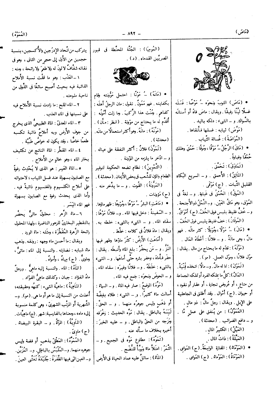 وَيُقَال مَا أحسن مَاء وَجهه رونقه وَذهب مَاء شبابه نضارته وَالنِّسْبَة إِلَى المَاء مائي وماوي (ج) مياه وأمواه