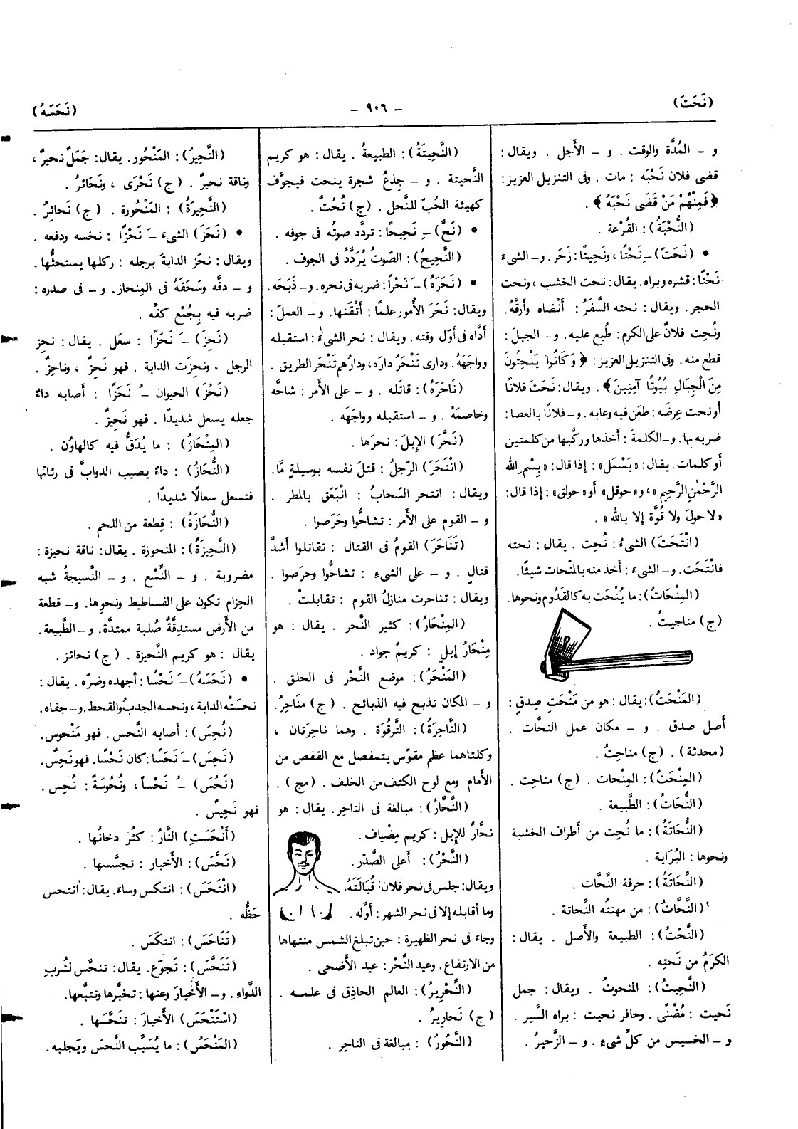 نحتا ونحيتا زحر وَالشَّيْء نحتا قشره وبراه يُقَال نحت الْخشب ونحت الْحجر وَيُقَال نحته السّفر أنضاه وأرقه ونحت فلَان على الْكَرم طبع عَلَيْهِ والجبل قطع مِنْهُ وَفِي التَّنْزِيل الْعَزِيز {وَكَانُوا ينحتون من الْجبَال بُيُوتًا آمِنين} وَيُقَال نحت فلَانا أَو نحت عرضه طعن فِيهِ وعابه وَفُلَانًا بالعصا ضربه بهَا والكلمة أَخذهَا وركبها من كَلِمَتَيْنِ أَو كَلِمَات يُقَال (بسمل) إِذا قَالَ (بِسم الله الرَّحْمَن الرَّحِيم) و (حوقل) أَو (حولق) إِذا قَالَ (لَا حول وَلَا قُوَّة إِلَّا بِاللَّه)