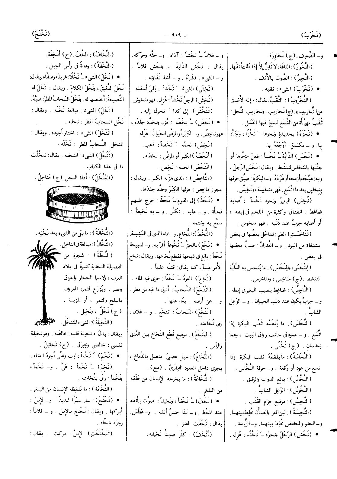 (النَّخْلَة) شَجَرَة من الفصيلة النخلية كَثِيرَة فِي بِلَاد الْعَرَب وَلَا سِيمَا الْحجاز وَالْعراق ومصر ويزرع لثمره الْمَعْرُوف بالبلح وَالتَّمْر أَو للزِّينَة (ج) نخل ونخيل