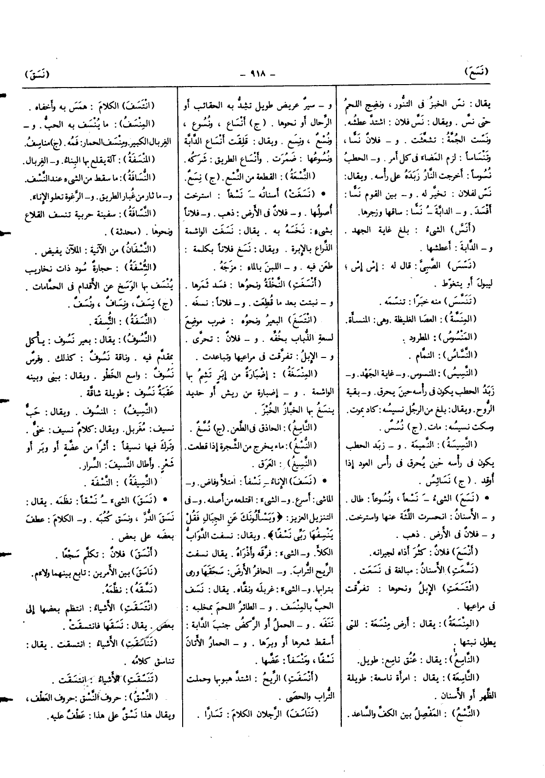 يُقَال نس الْخبز فِي التَّنور ونضج اللَّحْم حَتَّى نس وَيُقَال نس فلَان اشْتَدَّ عطشه ونست الجمة تشعثت وَفُلَان نسا وتنساسا لزم المضاء فِي كل أَمر والحطب نسوسا أخرجت النَّار زبده على رَأسه وَيُقَال نس لفُلَان تخير لَهُ وَبَين الْقَوْم نسا أفسد وَالدَّابَّة نسا سَاقهَا وزجرها