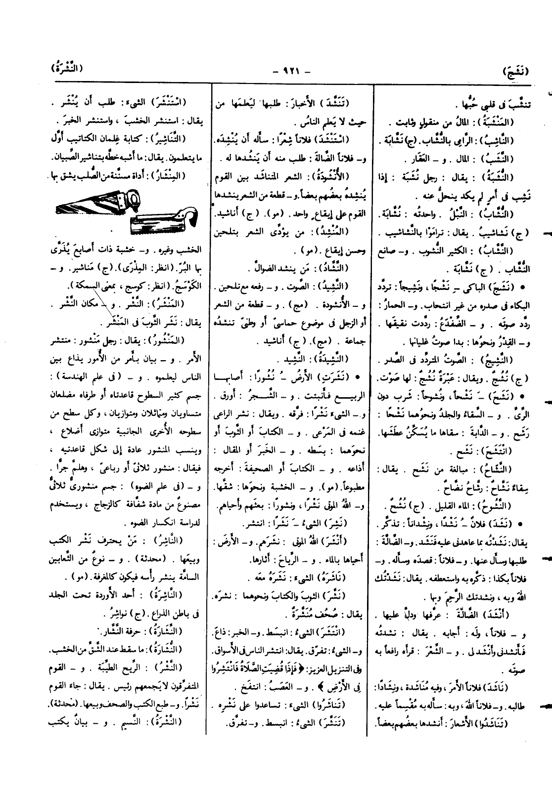 (الْمِنْشَار) أَدَاة مسننة من الصلب يشق بهَا الْخشب وَغَيره وخشبة ذَات أَصَابِع يذرى بهَا الْبر (انْظُر المذرى) (ج) مناشير والكوسج (انْظُر كوسج بِمَعْنى السَّمَكَة)