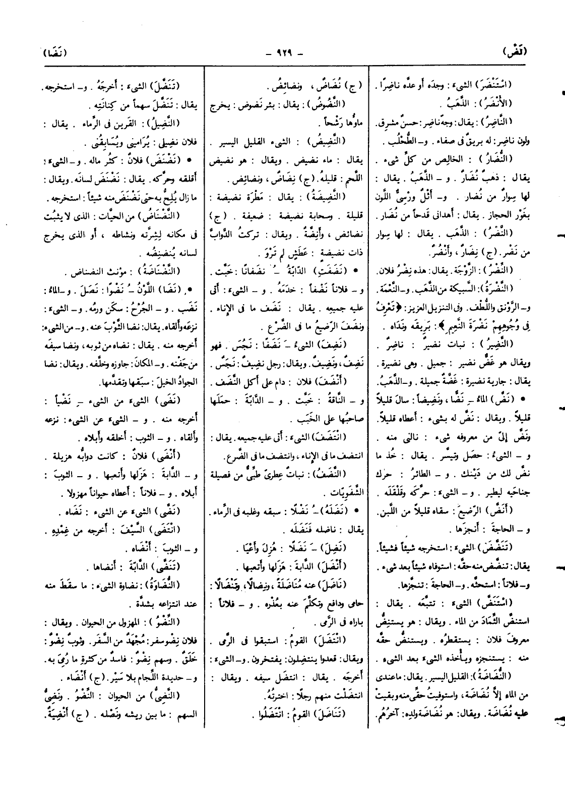 (نضى) الشَّيْء من الشَّيْء نضيا أخرجه مِنْهُ وَالشَّيْء عَن الشَّيْء نَزعه وألقاه وَالثَّوْب أخلقه وأبلاه