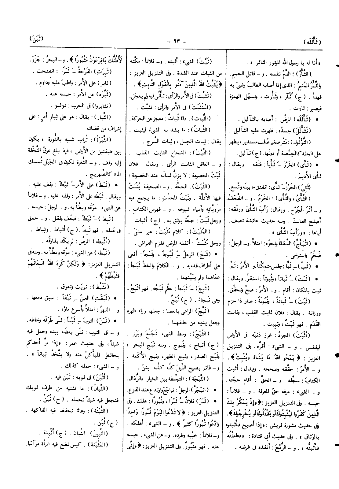 (ثَبت) الشَّيْء أثْبته وَفُلَانًا مكنه من الثَّبَات عِنْد الشدَّة وَفِي التَّنْزِيل الْعَزِيز {يثبت الله الَّذين آمنُوا بالْقَوْل الثَّابِت}