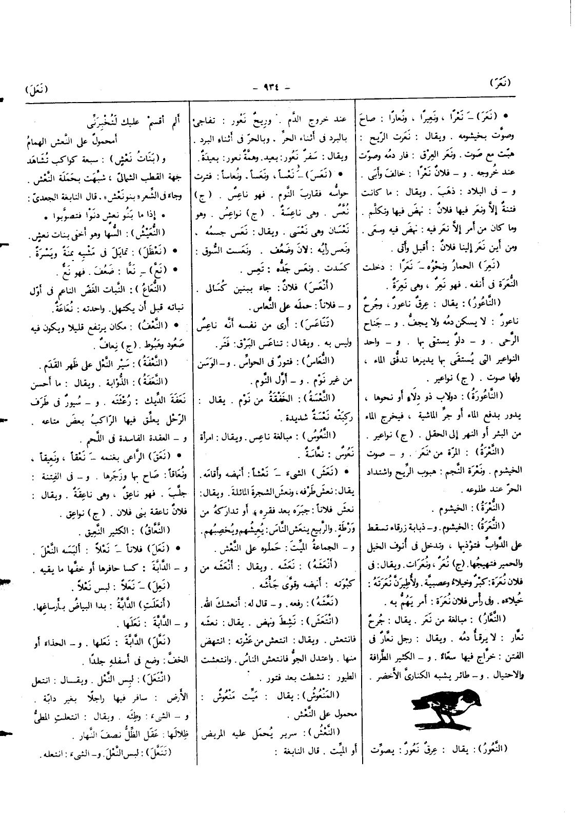 نعرا ونعيرا ونعارا صَاح وَصَوت بخيشومه وَيُقَال نعرت الرّيح هبت مَعَ صَوت ونعر الْعرق فار دَمه وَصَوت عِنْد خُرُوجه وَفُلَان نعرا خَالف وأبى وَفِي الْبِلَاد ذهب وَيُقَال مَا كَانَت فتْنَة إِلَّا ونعر فِيهَا فلَان نَهَضَ فِيهَا وَتكلم وَمَا كَانَ من أَمر إِلَّا نعر فِيهِ نَهَضَ فِيهِ وسعى وَمن أَيْن نعر إِلَيْنَا فلَان أقبل وأتى