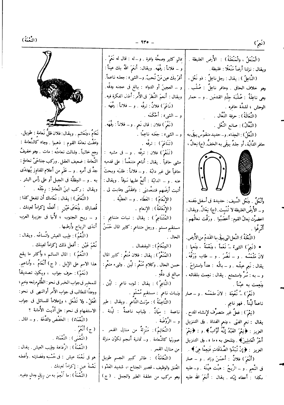 (النعامة) طَائِر كَبِير الْجِسْم طَوِيل الْعُنُق والوظيف قصير الْجنَاح شَدِيد الْعَدو وَهُوَ مركب من خلقَة الطير والجمل (ج) نعام ونعائم وَيُقَال فلَان ظلّ نعَامَة طَوِيل وَخفت نعَامَة الْقَوْم ذَهَبُوا وَجَاء كالنعامة رَجَعَ خائبا وشالت نعامته مَاتَ وَهُوَ خَفِيف النعامة ضَعِيف الْعقل وَركب جناحي نعَامَة جد فِي أمره وَعلم من أَعْلَام المفاوز يهتدى بِهِ والمظلة فِي الْجَبَل أَو على رَأس الْبِئْر وَيُقَال ركب ابْن النعامة رجله