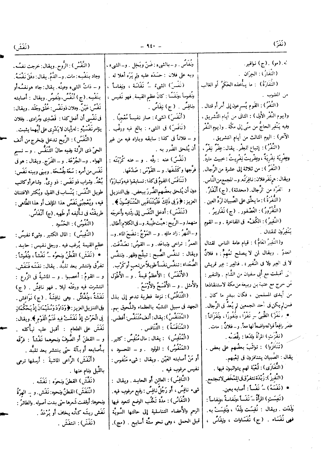 (النَّفس) الرّوح وَيُقَال خرجت نَفسه وحاد بِنَفسِهِ مَاتَ وَالدَّم يُقَال دفق نَفسه وَذَات الشَّيْء وعينه يُقَال جَاءَ هُوَ نَفسه أَو بِنَفسِهِ (ج) أنفس ونفوس وَيُقَال أَصَابَته نفس عين وَفُلَان ذُو نفس خلق وَجلد وَيُقَال فِي نَفسِي أَن أفعل كَذَا قصدي ومرادي وَفُلَان يؤامر نفسيه لَهُ رأيان لَا يدْرِي على أَيهمَا يثبت