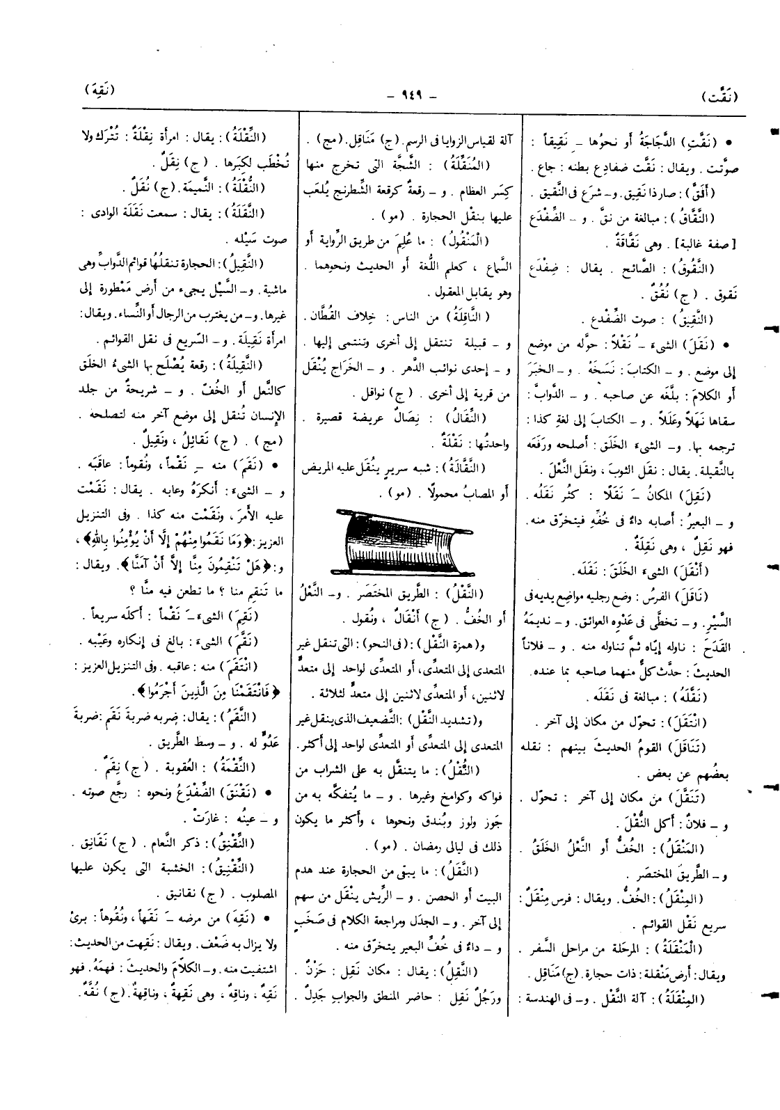 الشَّيْء نقلا حوله من مَوضِع إِلَى مَوضِع وَالْكتاب نسخه وَالْخَبَر أَو الْكَلَام بلغه عَن صَاحبه وَالدَّوَاب سَقَاهَا نهلا وعللا وَالْكتاب إِلَى لُغَة كَذَا تَرْجمهُ بهَا وَالشَّيْء الْخلق أصلحه وَرَفعه بالنقيلة يُقَال نقل الثَّوْب وَنقل النَّعْل