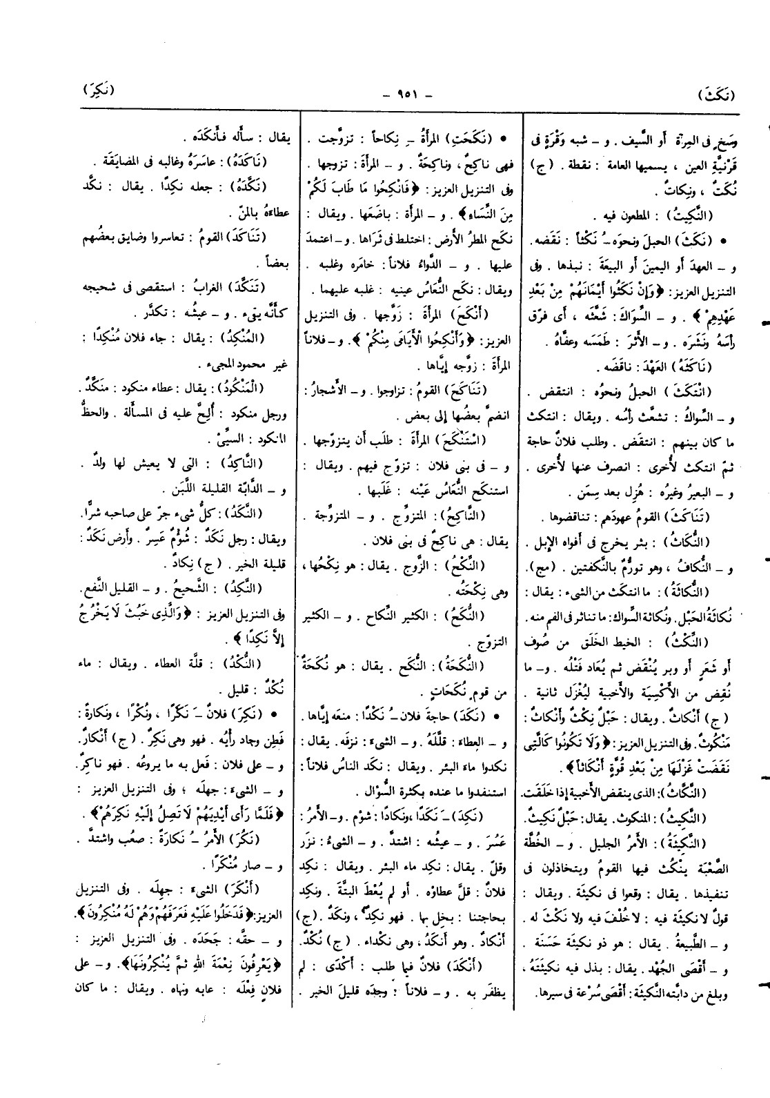 الْمَرْأَة نِكَاحا تزوجت فَهِيَ ناكح وناكحة وَالْمَرْأَة تزَوجهَا وَفِي التَّنْزِيل الْعَزِيز {فانكحوا مَا طَابَ لكم من النِّسَاء} وَالْمَرْأَة باضعها وَيُقَال نكح الْمَطَر الأَرْض اخْتَلَط فِي ثراها وَاعْتمد عَلَيْهَا والدواء فلَانا خامره وغلبه وَيُقَال نكح النعاس عَيْنَيْهِ غَلبه عَلَيْهِمَا